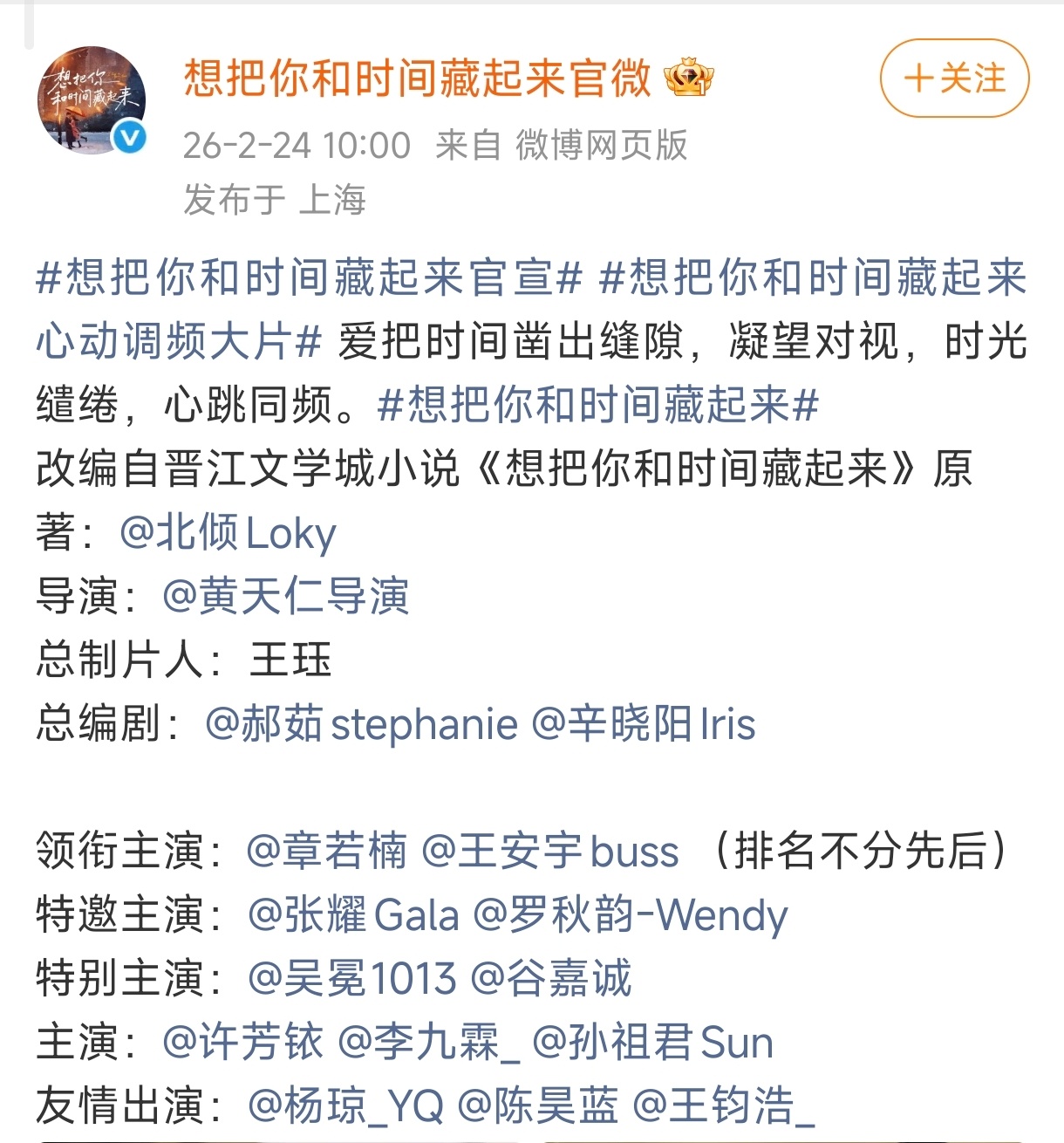 章若楠王安宇排名不分先后章若楠王安宇《想把你和时间藏起来》官宣,排名不分先后!已