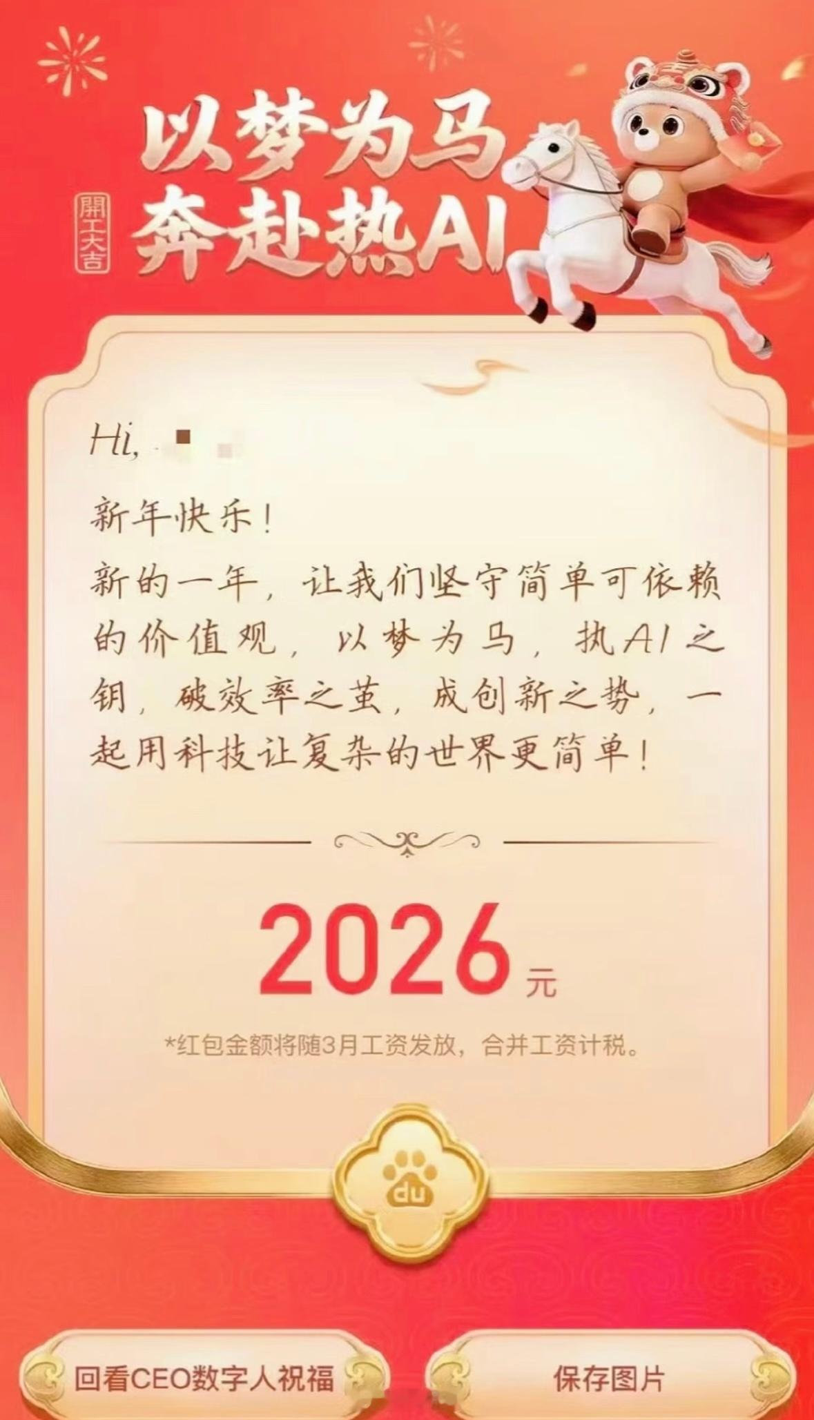 刚刷到的,今年百度开工红包,据说是365元、588元、666元、888元、2026元不等,实习生则可获得188元。