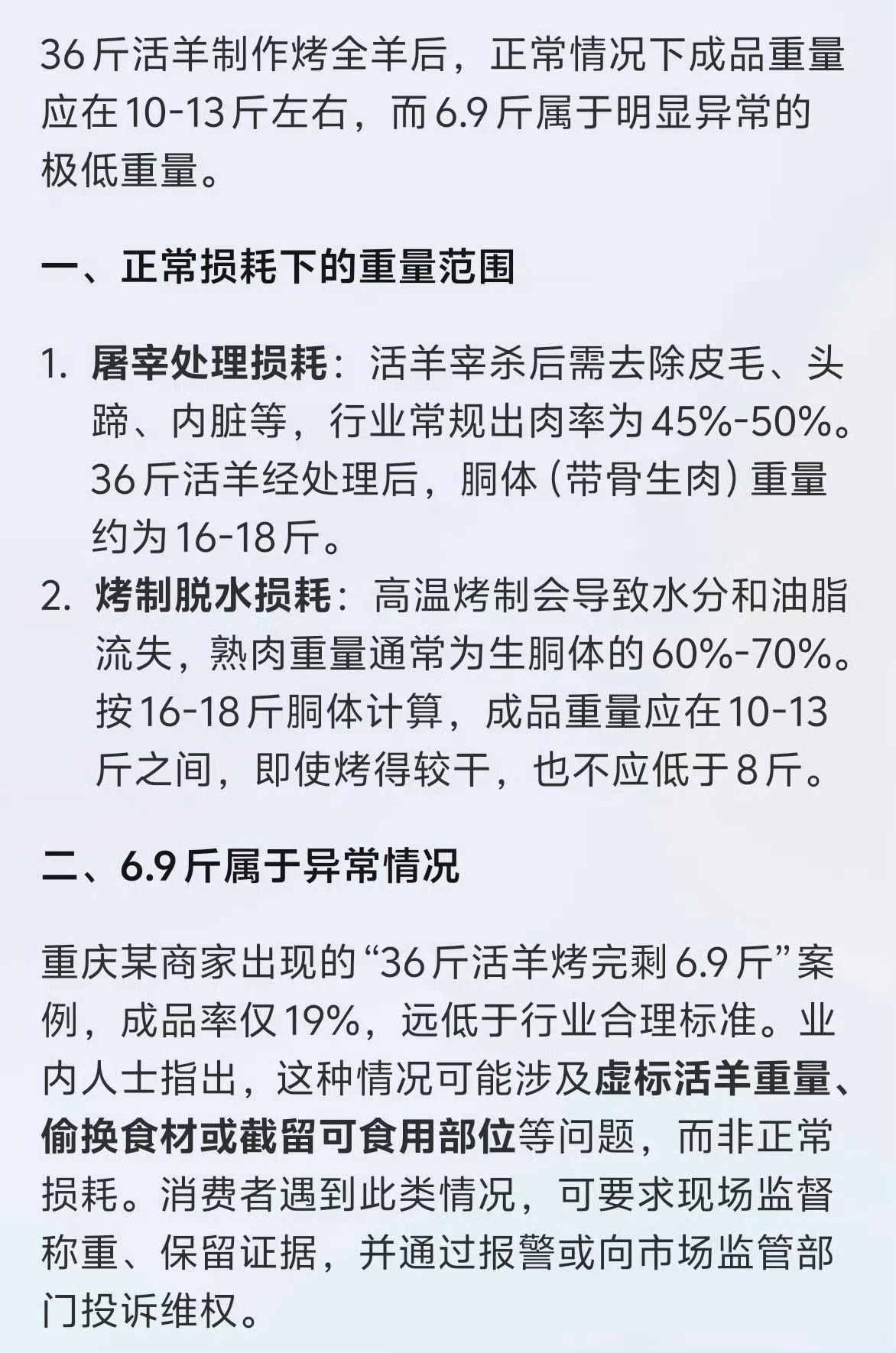 官方通报36斤羊烤完仅剩6.9斤销售前非正常喂食,这是个别商家还是行业潜规则?