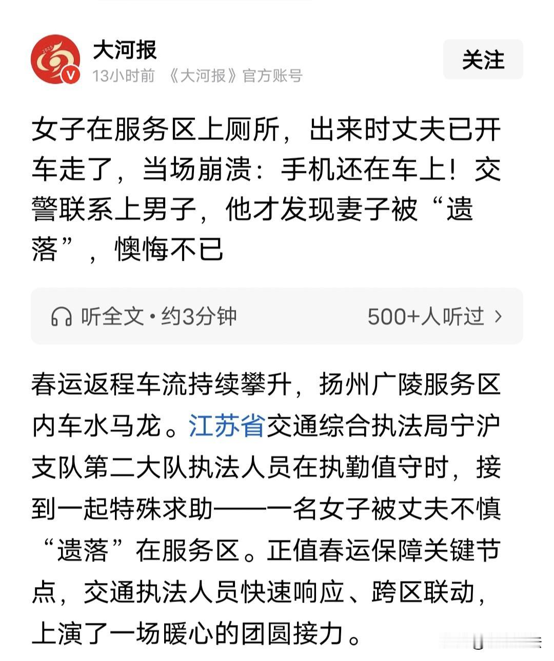 “心真大!”江苏扬州,女子从服务区的厕所出来,发现丈夫和车都不见踪影,当场崩溃,一摸兜手机也没带,差点急哭,她只好求助交通执法人员,才知丈夫已经到了下一个服务区了,当他知道妻子被“扔”下,非常懊悔。结局让人哭笑不得。 徐女士在服务区的厕所方便完,急匆匆的往出走,想着丈夫别等着急了,当她出来一看,瞬间傻眼了…… 她发现丈夫和货车都没了踪影,原来的地方已被别的车停靠了,她懵了,丈夫竟然开车走了,压根没等她。 徐女士当场崩溃,这不靠谱的老爷们还能不能行了,怎么车里少个人都不知道啊!她焦急万分,看着陌生的地方,人来车往,她一时不知怎么办才好。 徐女士想着给丈夫打电话,一摸兜才想起来,手机放车里了,真是雪上加霜。 在陌生的服务区,她孤零零一个人,不知如何是好,她在心里把丈夫骂了一个遍,冷静下来后,她只好去向交通执法人员求助。 原来,春节接近尾声,许多人开始返程,高速上车流涌动,大家都准备回去上班,开始一年的新征程,徐女士和丈夫蔡先生也不例外。 当时,徐女士和丈夫开着重型厢式货车停在了一个服务区休息。 徐女士有点憋的慌,也没告诉丈夫,就下了车去厕所了,她也没多想,以为自己下车丈夫能不知道嘛。 于是,她直奔卫生间,去方便了。 而蔡先生也是粗心大意,妻子下车他根本没有注意,还以为她在车上歇着呢,也没有问一声,直接开车走人。 这边徐女士被丢下了后,她是干着急。执法人员安慰她别着急,马上帮她联系蔡先生。 费了一番功夫,终于联系上了蔡先生,这时,蔡先生已经到了下一个服务区了,他才发现自己把妻子落下了,当时非常后悔,说他会停车等着妻子。 执法人员考虑到车流量大,让徐女士一个人去找丈夫还是存在一定危险的,随即联系相关人员将徐女士从服务区接走,交接给另一波工作人员,最终,将徐女士平平安安送到蔡先生身边。 夫妻俩重逢之后,一起向执法人员表示感谢,“多亏有你们帮忙,太感谢您们了,不然我真不知道怎么办了。” 这种事情经常发生,我们要为交警的这种行为点赞,这种接力体现了人民警察爱人民,为了人民的利益,不辞辛苦,完成使命。 有人说,停在服务区就是为了休息或上厕所,老公看都不看一下或问都不问一下老婆在不在车上,就直接开走,这种马大哈丈夫迟早会因粗心出事。 也有人说,多大的事还焦急万分,服务区找个电话打一下让他在下个服务区等,自己再找个愿意搭车的过去就好了。 有网友分享:我也干过,我女儿坐后面,我老婆从左边开门放衣服,然后关门准备从右边上车,然后我就走了,一边走还跟我老婆说话,没回应,女儿大概四五岁,也没说话,开着开着老婆打电话来了。 有这么个丢三落四、粗心大意的丈夫真是头大。你说你车子启动的时候,也不看一看,也不问一问人上来了没有?扭头就走。妻子也缺乏必要的沟通,上厕所的时候,给丈夫说一声啊,都是金嘴,难开口。 其实这事儿不能全怪丈夫,跑长途的司机,脑子里的弦绷得比货车弹簧还紧。 服务区停个车休整后,着急赶路,也不记得回头看一眼?妻子估计也是累得够呛,下车直奔厕所,连手机都没拿,俩人都没想到会因为少了一句沟通,闯了祸。 但话说回来,夫妻过日子,细节最见真心。哪怕再赶时间,下车前说一句“我去厕所,等我会儿”,或者开车前问一句“老婆在不在车上”,这几分钟的功夫,能省多少麻烦? 根据法律,驾驶人在开车前有义务观察车辆周边环境及车内状况,确保行车安全。 作为重型货车司机,出发前不清点随车人员、不确认舱门状态,本质上是一种疏忽大意。 春运期间长途开车,夫妻本该互相提醒、确认对方状态,像这种“以为对方在车上”的疏忽,本质上是没尽到基本的注意义务。