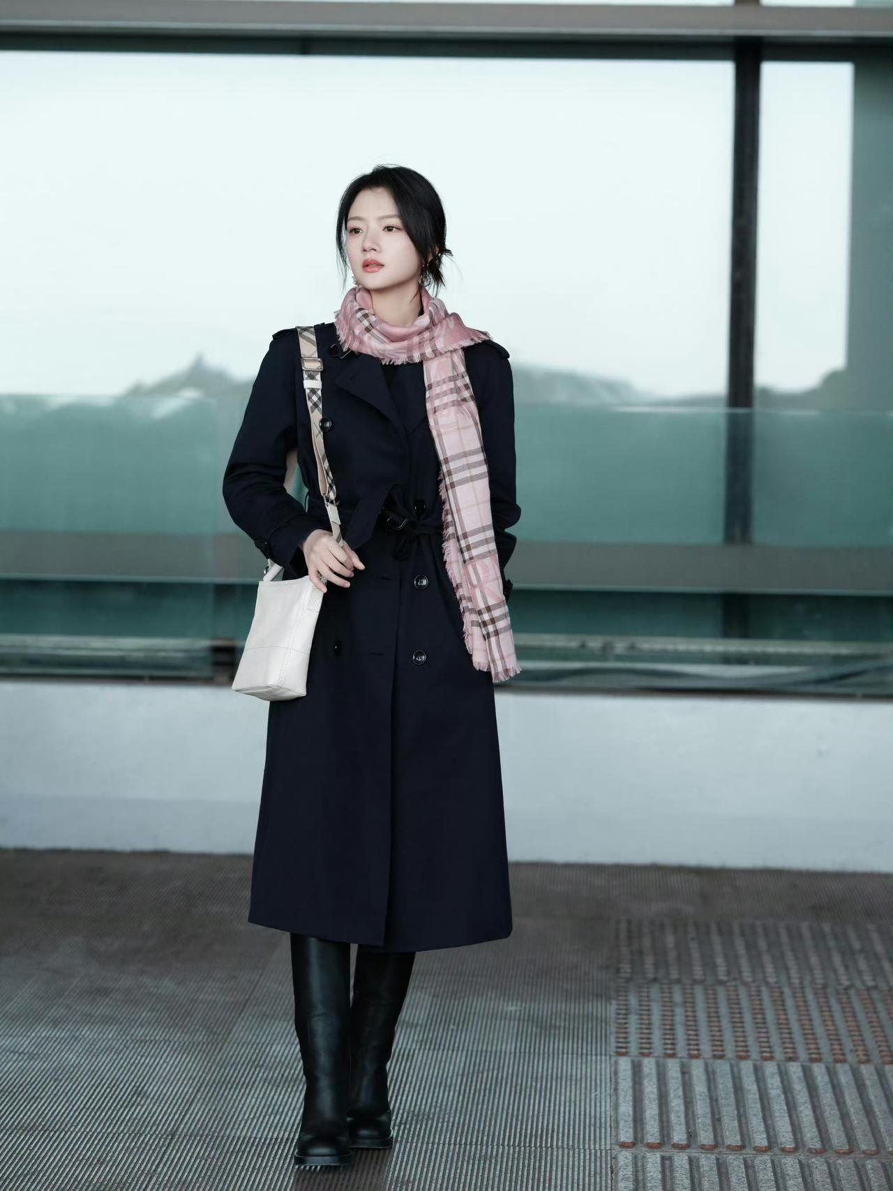 任敏×Burberry:当文艺片女主遇上百年英伦风衣 当任敏穿上Burberry经典款风衣,清冷淡雅的文艺片气质与百年英伦风骨碰撞出了奇妙的化学反应。 在机场出发的镜头里,她身着一袭藏青色双排扣风衣,利落的翻领与收腰设计勾勒出舒展身形,既保留了风衣的飒爽气场,又衬得她眉眼间的清冷感愈发突出。同系列格纹包袋与粉色格纹围巾作为点睛之笔,在沉稳底色中注入了柔和层次,让整体造型既有经典质感,又不失少女的灵动。 这种穿搭的妙处在于,它没有刻意堆砌潮流元素,而是用最克制的剪裁和最纯粹的色彩,让演员本身的气质成为造型的核心。 任敏自带的文艺片质感,恰好与Burberry风衣的“克制美学”不谋而合——没有过度张扬的设计,却在每一处细节里藏着高级感,就像她塑造的角色,看似清淡,却有着直击人心的力量。 从伦敦大秀到日常出行,任敏总能把Burberry的经典单品穿出自己的味道。这不仅是对时尚的精准把控,更是一种“人衣合一”的松弛感:当百年风衣的风骨遇上演员的灵气,便成了最动人的时尚叙事。   💡 穿搭小tip:像Burberry风衣这样的经典单品,搭配时可以遵循“少即是多”的原则,用同色系内搭和简约配饰突出质感,让经典设计成为造型的主角。