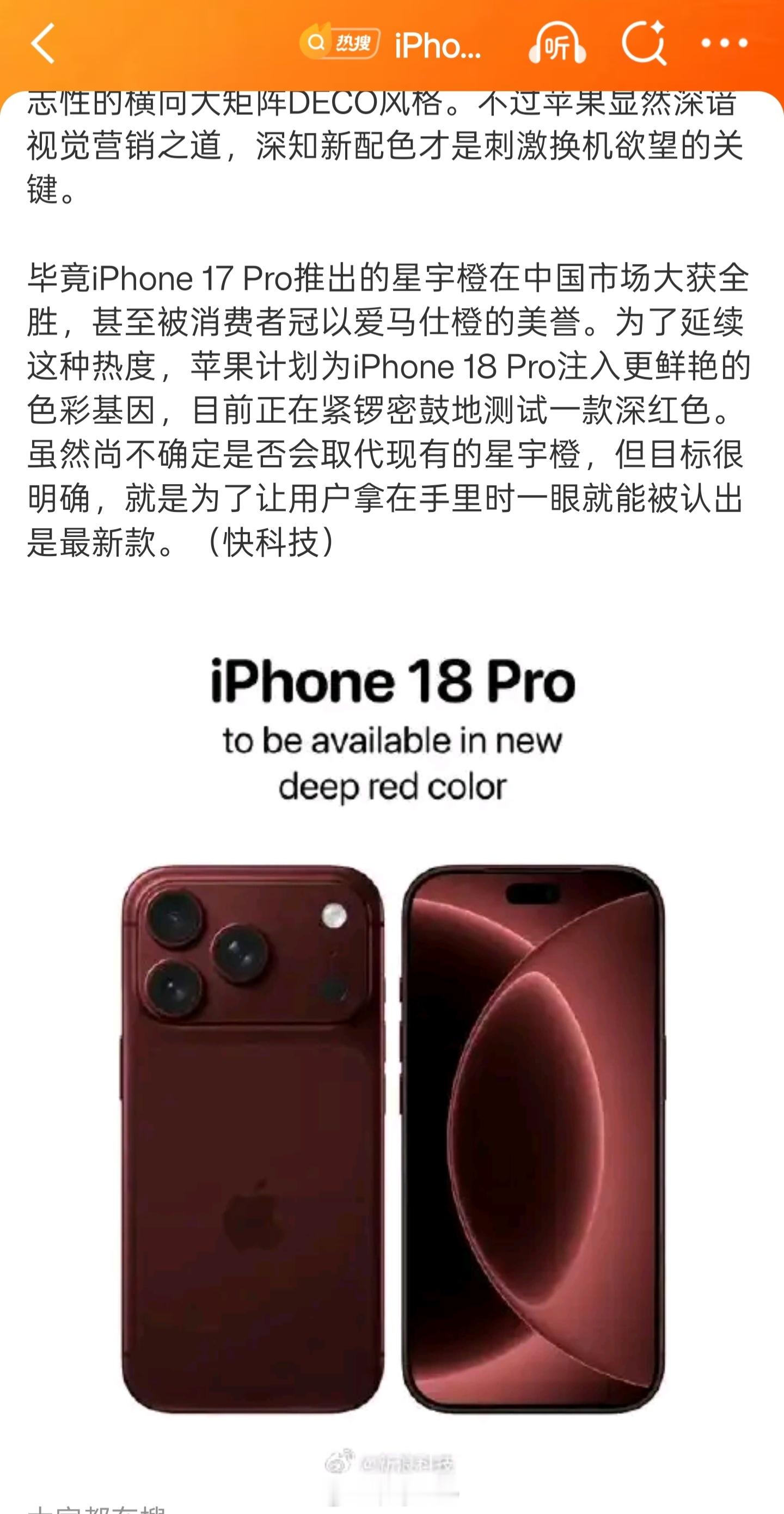 红色换个深浅、调个饱和度,你说调的好看也就算了,这红色调得又闷又普通,毫无层次和灵气,看完只觉得就这?设计师还是太好当了。完全没有当初的iPhone 8红色的那种惊艳感,温润的红色,自带高级感。再看看隔壁小米新SU7赤霞红,也比18的红色好看。