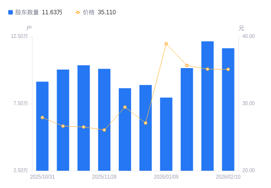 日期A股户数(户)流通A股户均持股数(股)户均持股市值(万元)2026-02-101162665616.7419.722026-01-301213945379.4718.902026-01-201014416437.5922.972026-01-09795458209.6431.952025-12-19888607349.0419.922025-12-10865057549.1122.252025-11-281009406469.5416.872025-11-201035726305.1416.722025-11-101003876505.1817.342025-10-31913497148.8019.97