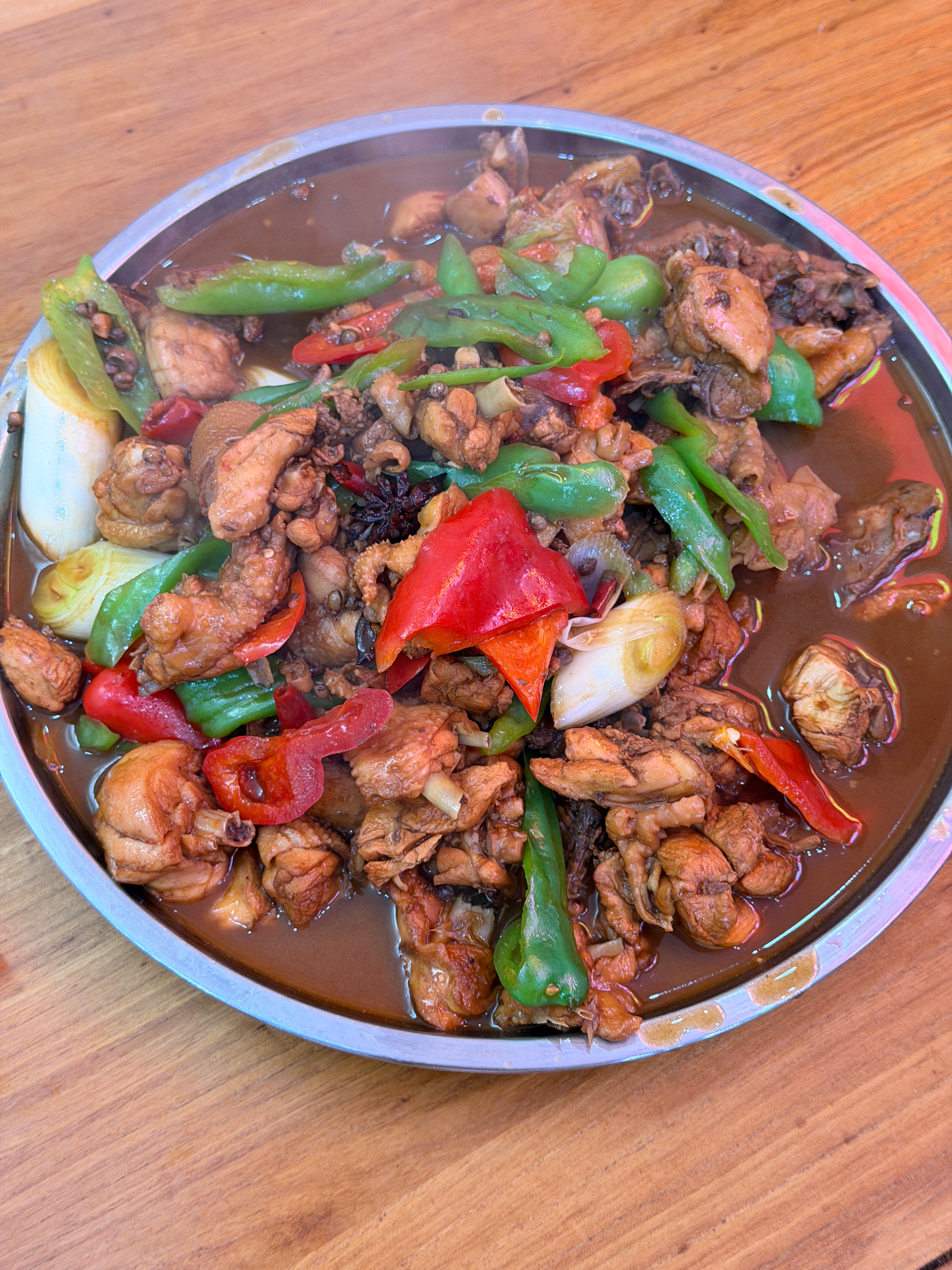 在服务区冲了会儿电,感觉蔚来换电也还是方便,换了就走。不过充电的时候,刚好休息下吃了个临沂炒鸡,好吃好吃!