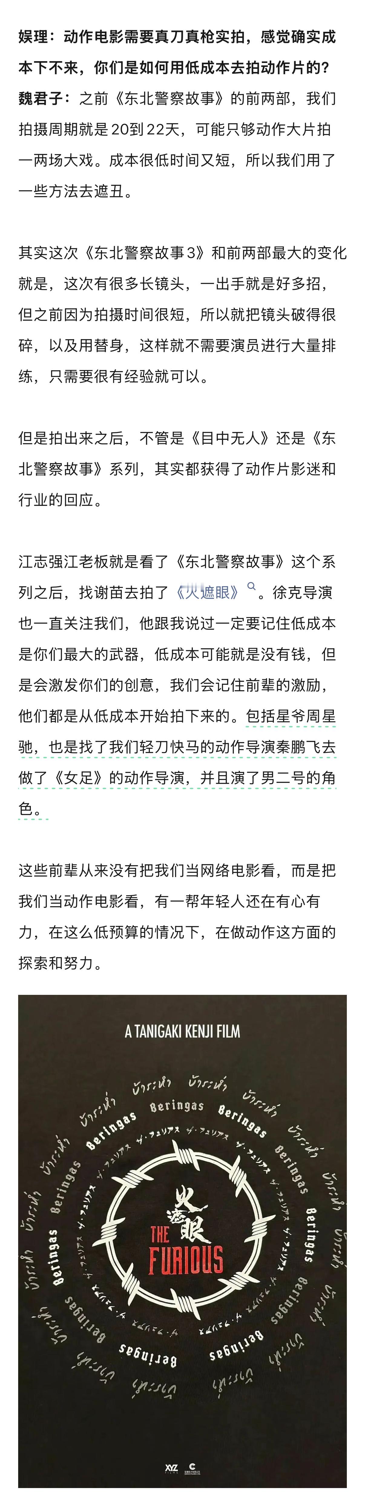 业内说捕风追影是动作片非常好的形态业内称动作电影非常吃成本吃明星 《东北警察故事3》出品人、总制片人在做影评人和媒体人阶段长期研究香港电影。2020年他导演了讲述香港动作片幕后故事的纪录片《龙虎武师》。之后带着多年对动作片的思考与观察,他操盘建立了动作厂牌轻刀快马,开始在网络电影领域拍动作片。