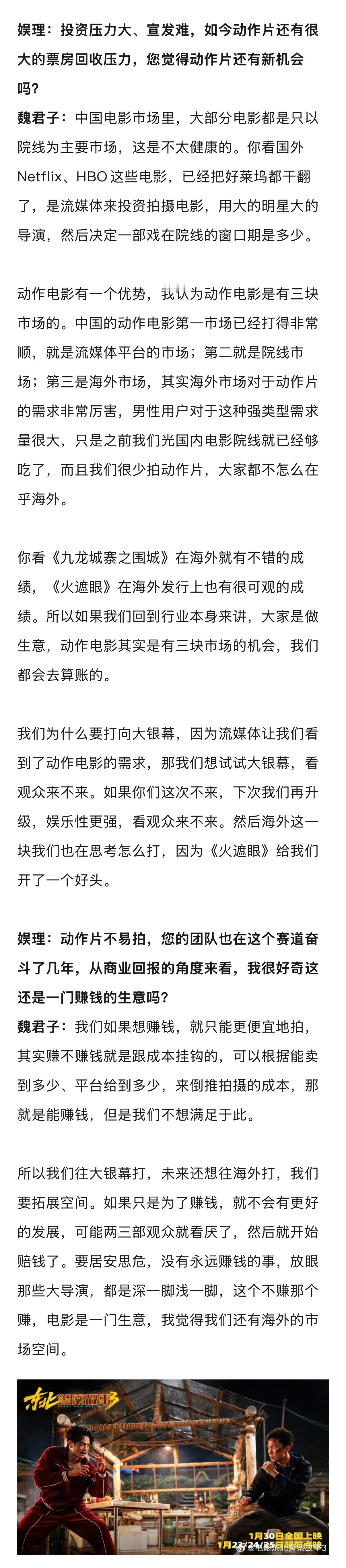 在魏君子看来,动作电影还面临着一个很现实的问题,“动作片非常吃成本、吃明星。动作电影一个ending拍个一周、10天都是非常正常的事情,成龙大哥甚至可以拍一个月,因为需要花钱花时间,投资商就需要票房保证,就得有大明星。如果没有这些大明星,投资商不敢开项目。”