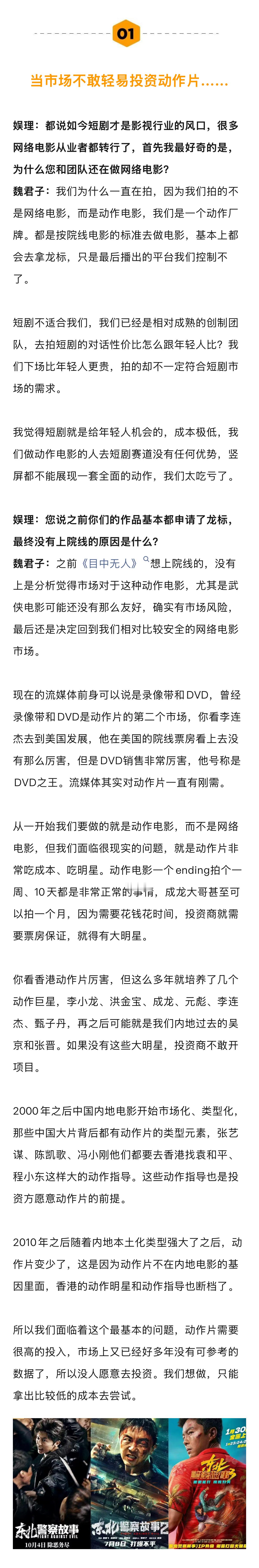 谈及为何没去短剧赛道,魏君子向新浪娱乐工作室直言表示不适合,“我们已经是相对成熟的创制团队,去拍短剧的对话性价比怎么跟年轻人比?我们下场比年轻人更贵,拍的却不一定符合短剧市场的需求。我觉得短剧就是给年轻人机会的,成本极低,我们做动作电影的人去短剧赛道没有任何优势,竖屏都不能展现一套全面的动作,我们太吃亏了。”