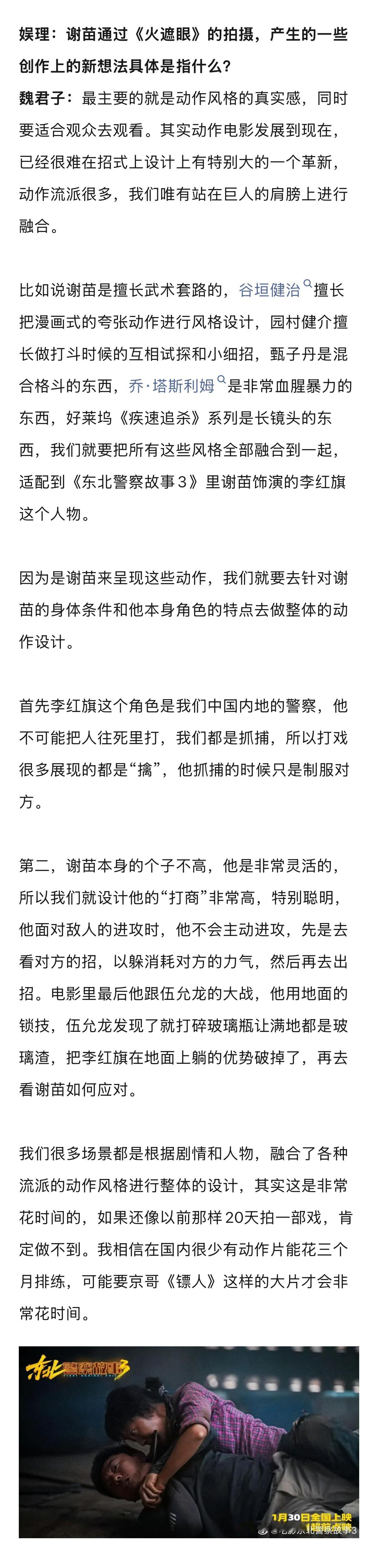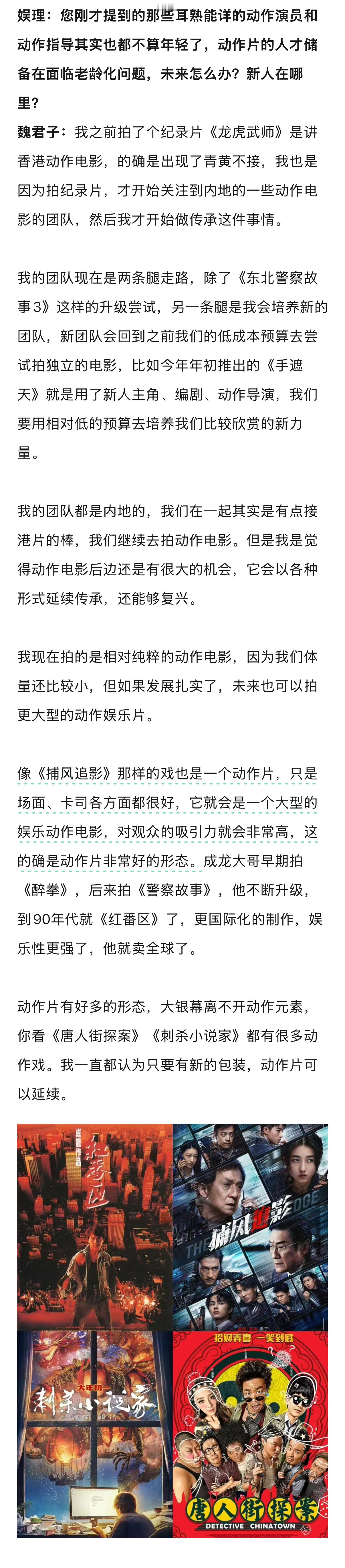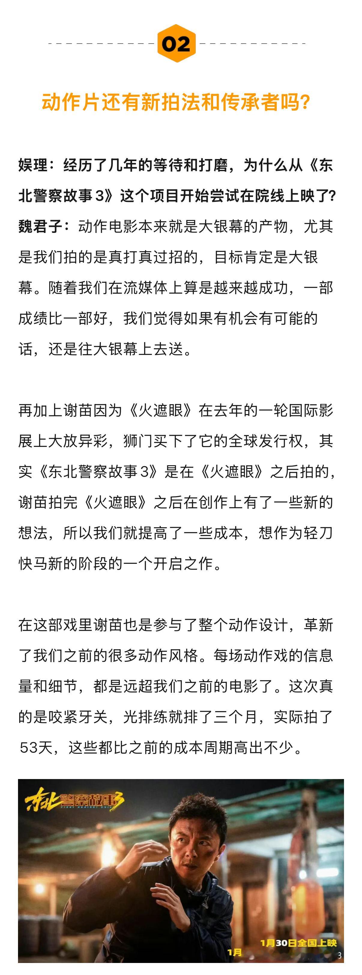在《东北警察故事3》完成升级并上了院线之外,魏君子还谈到了大型动作娱乐片的可能:“像《捕风追影》那样的戏也是一个动作片,只是场面、卡司各方面都很好,它就会是一个大型的娱乐动作电影,对观众的吸引力就会非常高,这的确是动作片非常好的形态。大银幕离不开动作元素,你看《唐人街探案》《刺杀小说家》都有很多动作戏。我一直都认为只要有新的包装,动作片可以延续。”娱理独家↓