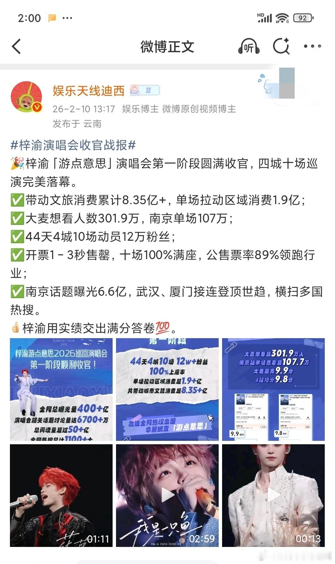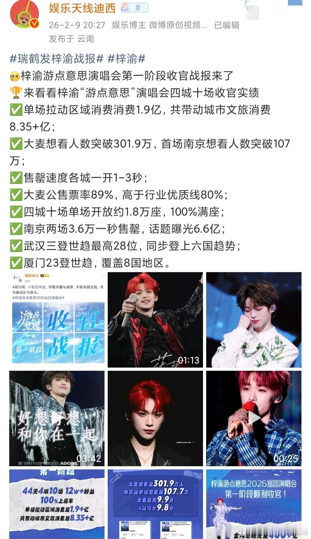 梓渝2025总结梓渝演唱会收官战报 梓渝演唱会收官战报2025年梓渝用实绩交出满分答卷💯✅是四城十场演唱会完美收官的一年✅是12场音乐节+带动各城市文旅消费上亿的一年✅是时尚资源成绩创造杂志销量top+其它杂志领跑内娱杂志销量的一年✅是爆火以后粉丝粘性巨大带货能力顶级带动品牌方各项真实商务数据断层领跑的一年✅是公益并行不忘初心发挥偶像力量带领粉丝一起做公益的一年✅是不论上浮市场🍠还是下沉平台抖,以及各个平台数据依靠活粉和真实数据拔筹的一年 梓渝