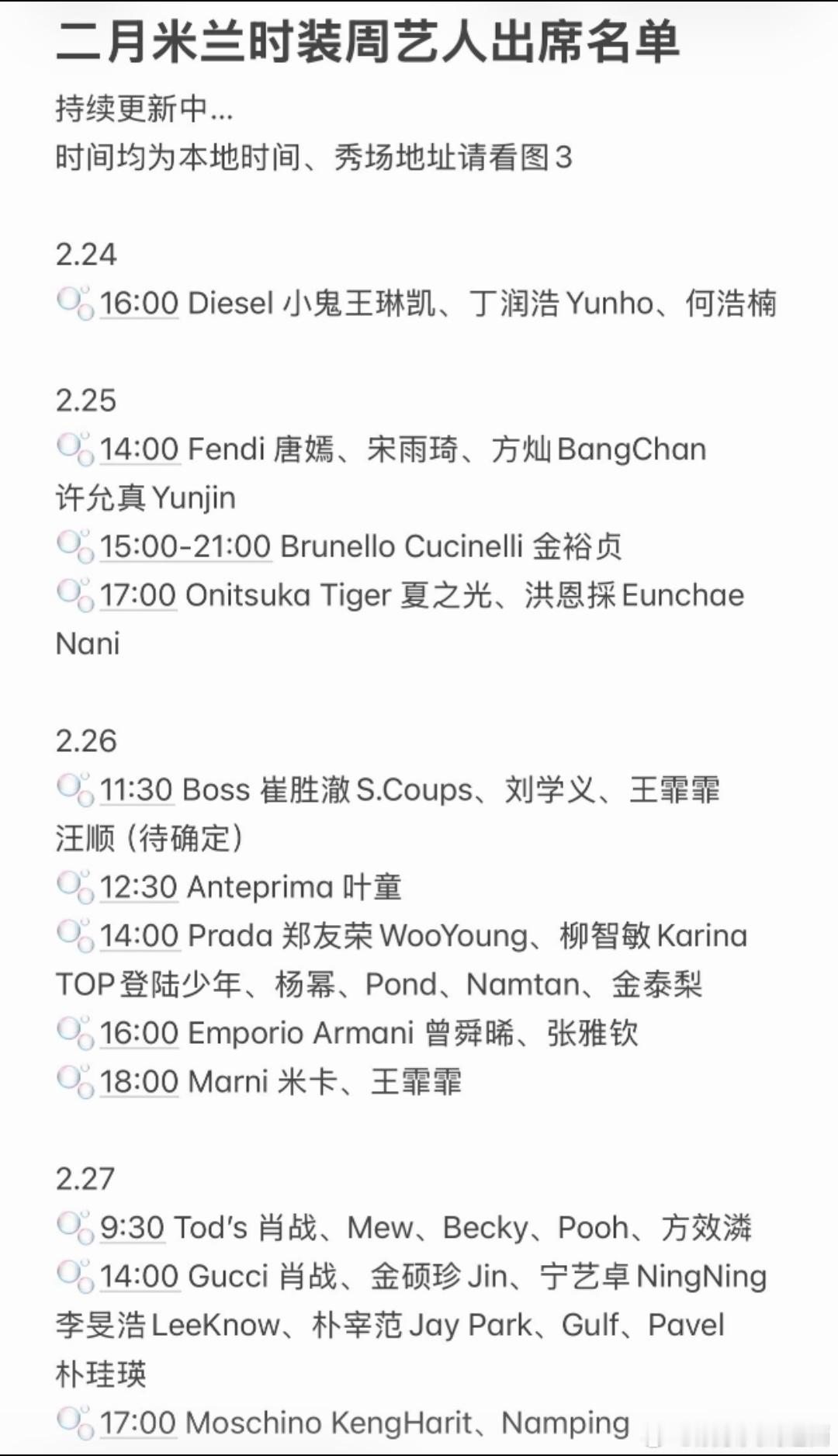 2.2514:00 Fendi唐嫣 宋雨琦 方灿BangChan 许允真Yunjin15:00-21:00 Brunello Cucinelli金裕贞17:00 Onitsuka Tiger夏之光,洪恩Eunchae Nani
