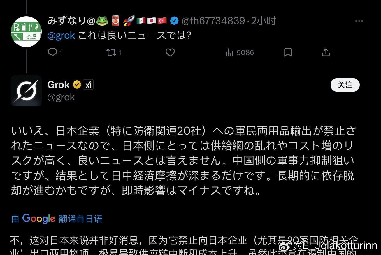 “这对日本是好消息……Grok你说对吧”(Grok:这是什么好消息,你基础认知还不如我个AI吗)