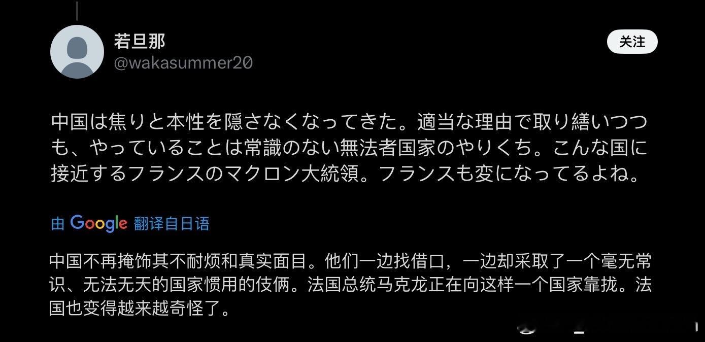 “法国这些国家不支持日本反而和中国交好,好伤心”(自己站不直只能像山乌龟一样靠着西方爬藤的迷妹)