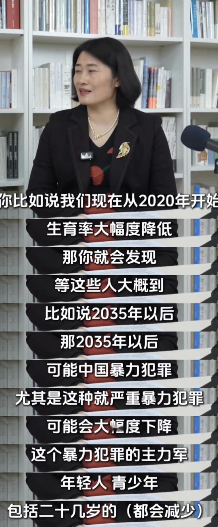 清华大学女教授表示:美国的犯罪率下降可能跟它生育率的降低有很大关系,而我们现在从2020年开始,生育率大幅降低,到2035年以后,中国的这种严重暴力犯罪可能就会下降,因为到时包括二十几岁的年轻人、青少年都会减少。