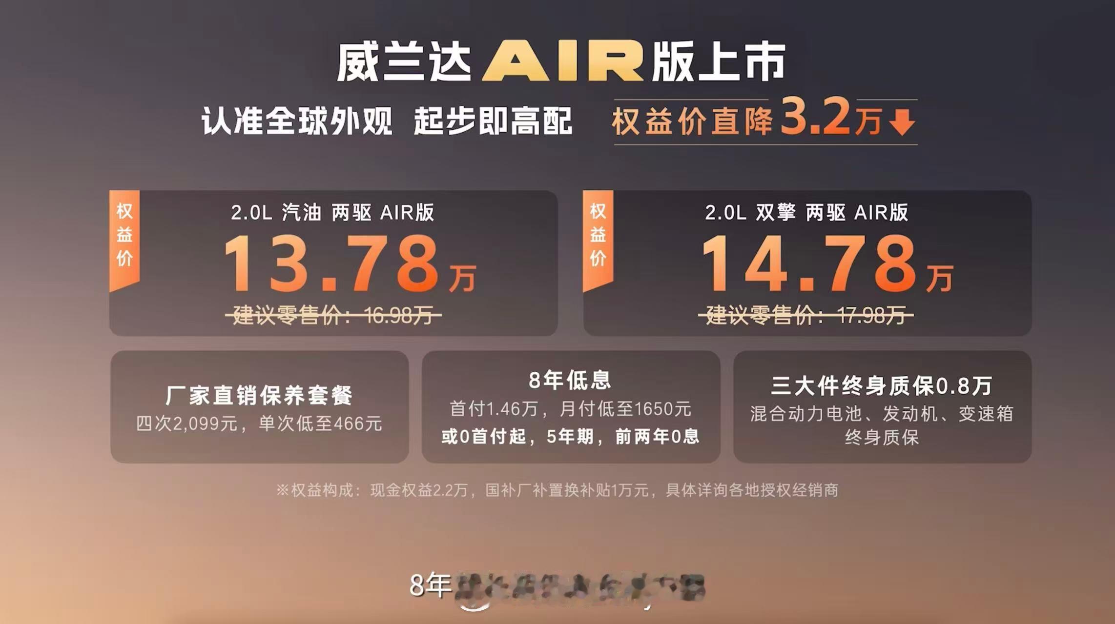 13万级威兰达AIR版,圆你的丰田梦,2.0L汽油两驱版本只要13.78万,燃油车今年的含金量再次提高,全球外观设计,四次保养仅2099元,主打一个一次到位,真省事。