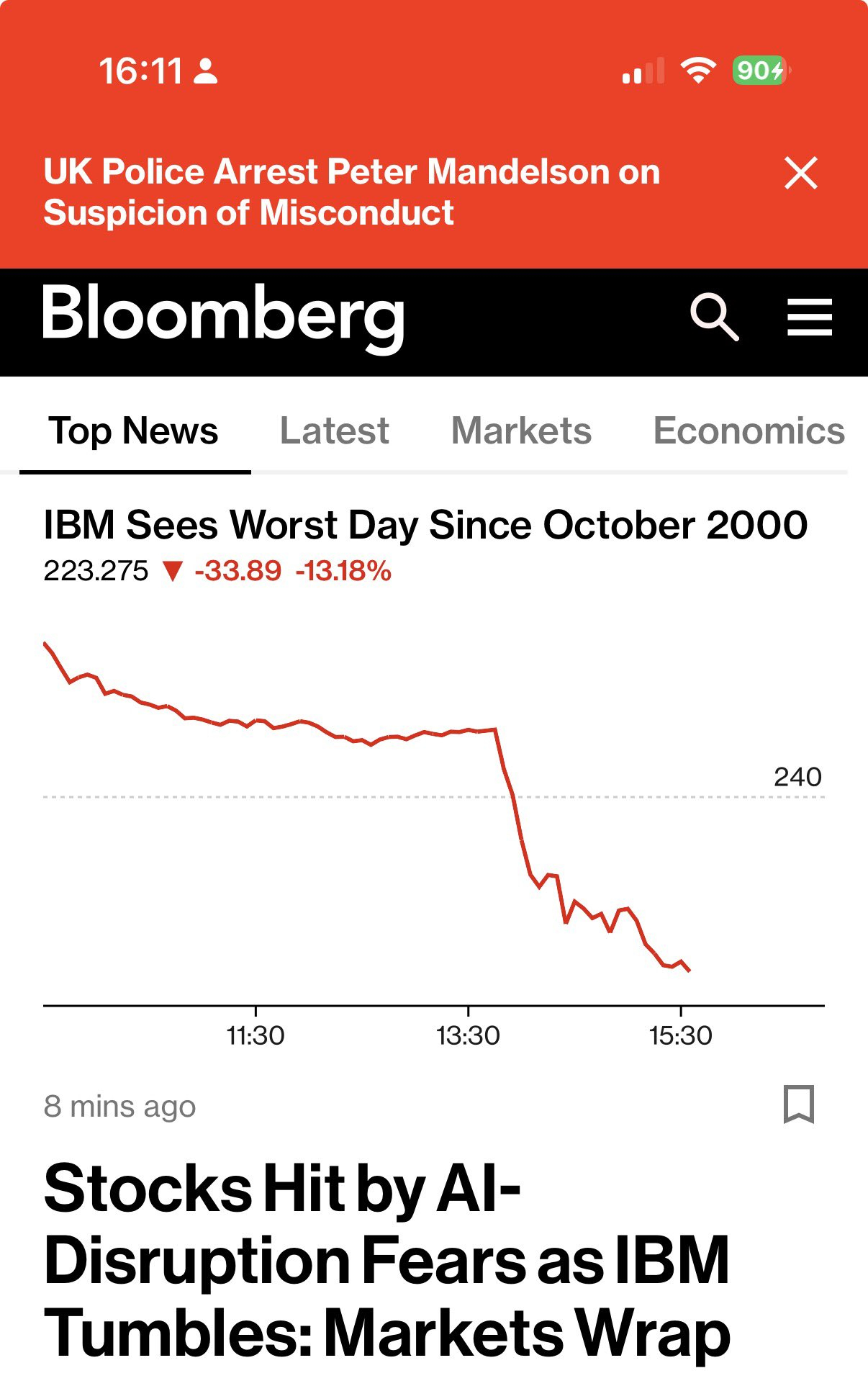 传统IT时代最坚硬的堡垒被攻破:Anthropic将推出COBOL自动化AI工具;IBM股价应声下跌13%,创2000年以来最大跌幅~~~~~~~~~太吓人了,感觉无所不被替代