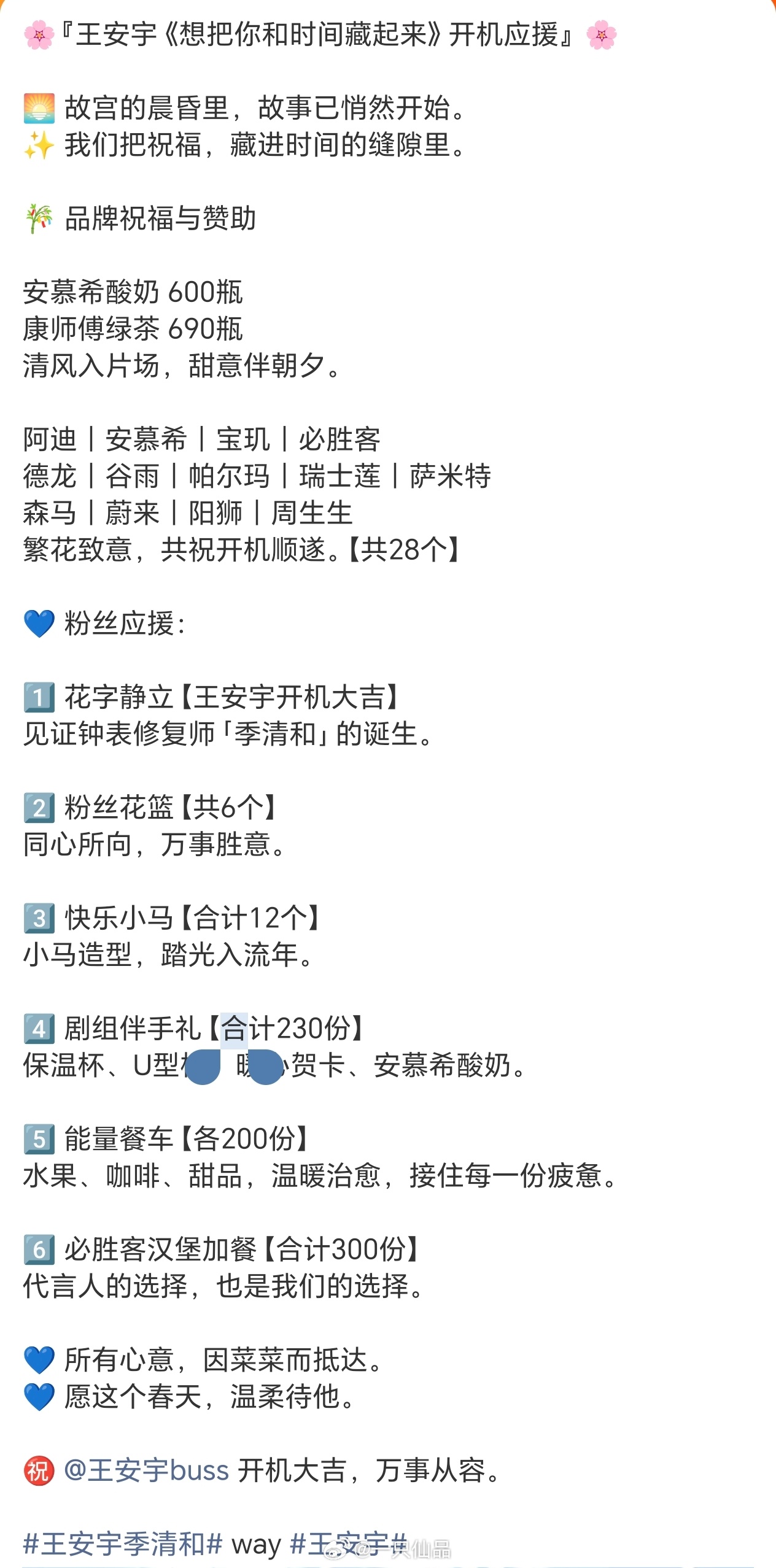 王安宇《想把你和时间藏起来》开机应援一番男主季清和排面🈶,品牌霸霸们好宠呀,后援会也是超给力的,期待王安宇季清和,㊗️王安宇开机大吉王安宇季清和