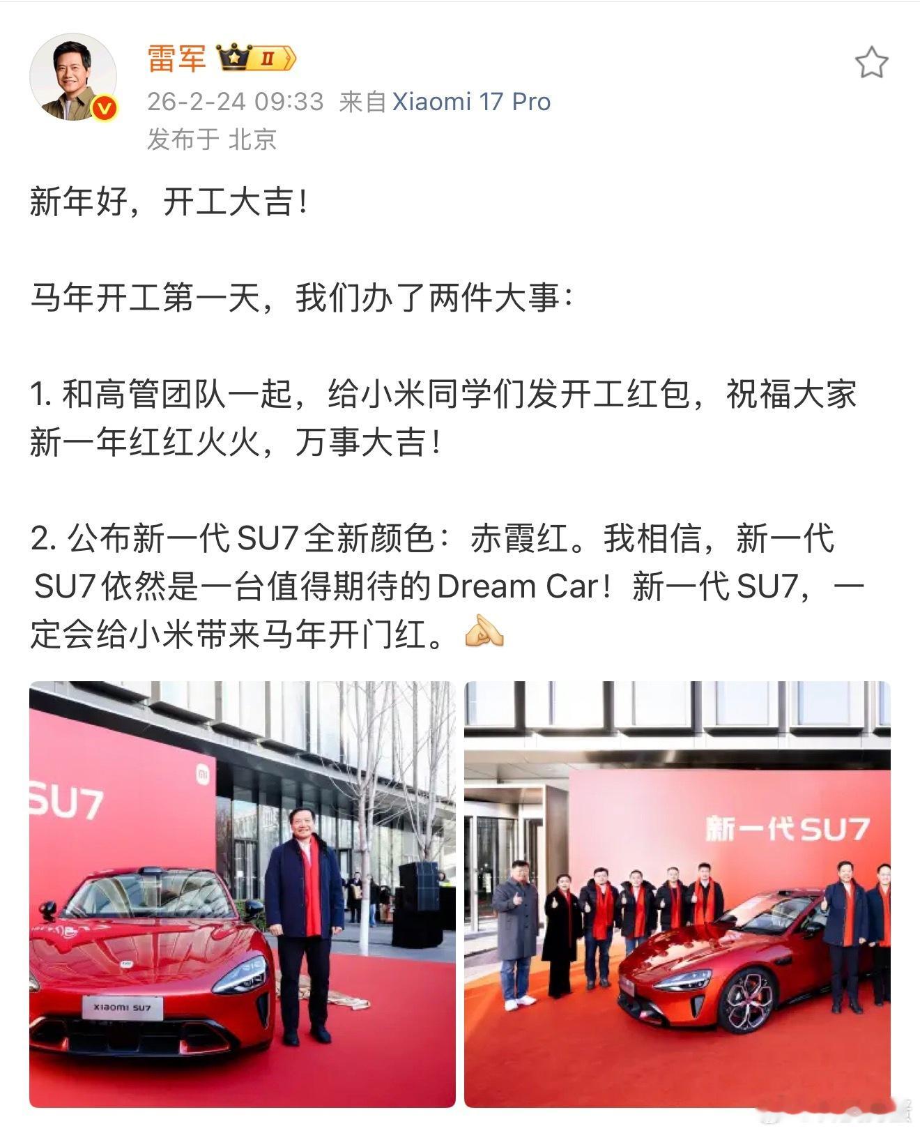 所以雷军称相信新SU7会大卖我也相信,赤霞红一定会给小米带来马年开门红,新的一年一定会更好