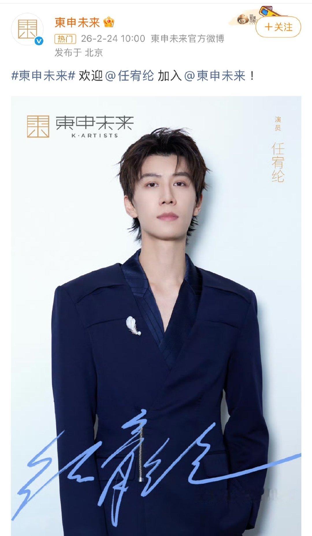 任宥纶进东申未来了任宥纶官宣加盟东申未来 东申未来官宣任宥纶加入,那就期待一波新戏了哈~娱乐