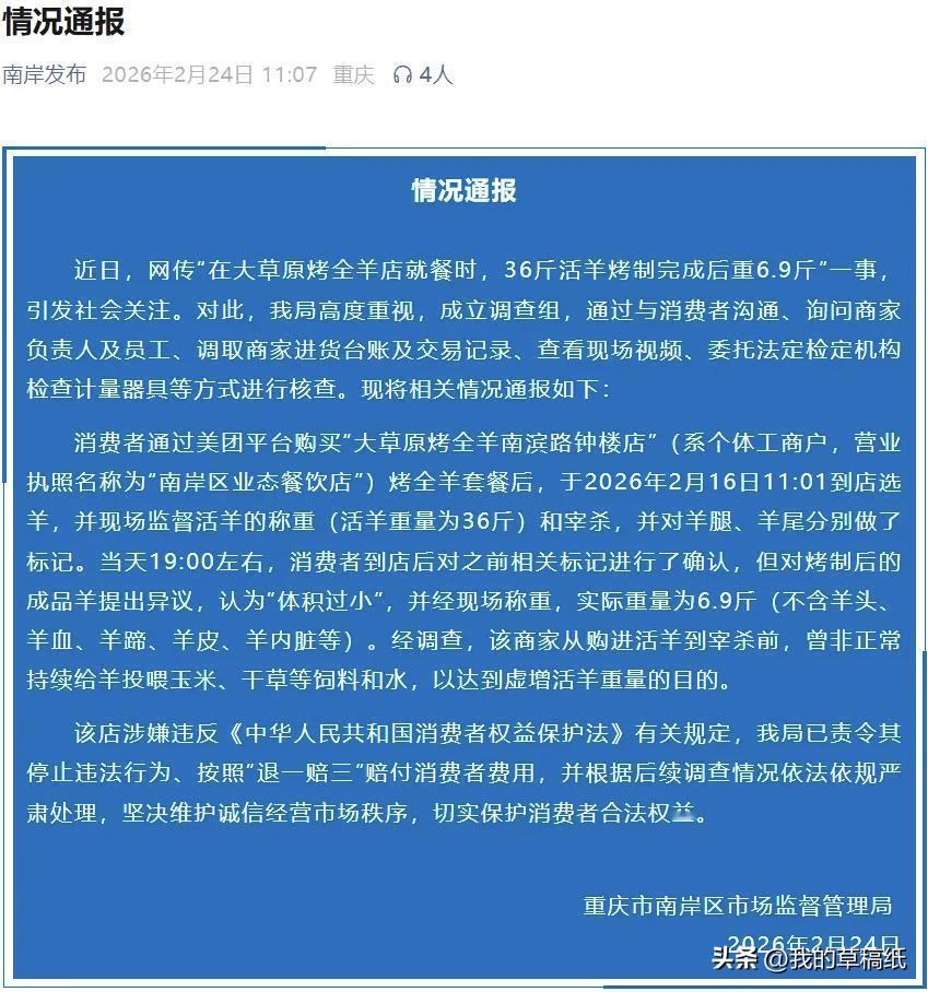 活羊36斤烤完只剩6.9斤?官方今天通报了!真相让人气炸! 刚才刷到这条新闻,重庆市场监管刚刚发的通报。说实话,看完我手里的烤串都不香了。 事情是这样的:2月16日,王女士在重庆南滨路一家烤全羊店,1188元套餐,现场挑了一只36斤的活羊,还特意在羊腿、羊尾上做了标记。心想这回跑不了吧? 结果晚上烤好端上来,傻眼了——羊特别小,薄得几乎没有肉!一称,6.9斤(不含头、血、蹄、皮、内脏)。 36斤变6.9斤,少了80%多!商家还狡辩说烤得比较干。干?这是烤成羊肉纸了吧? 今天官方通报来了:调查发现,商家从购进活羊到宰杀前,非正常持续给羊喂玉米、干草和水,故意虚增重量! 说白了,就是让羊临死前拼命吃、拼命喝,你买的是羊,其实付钱的是草料加自来水! 好在现在处理了:退一赔三,责令停止违法行为。但我想说,赔钱就完了?这种人根本不配开店! 你遇到过这种缺斤少两的套路吗?来评论区曝光,让大家避雷!