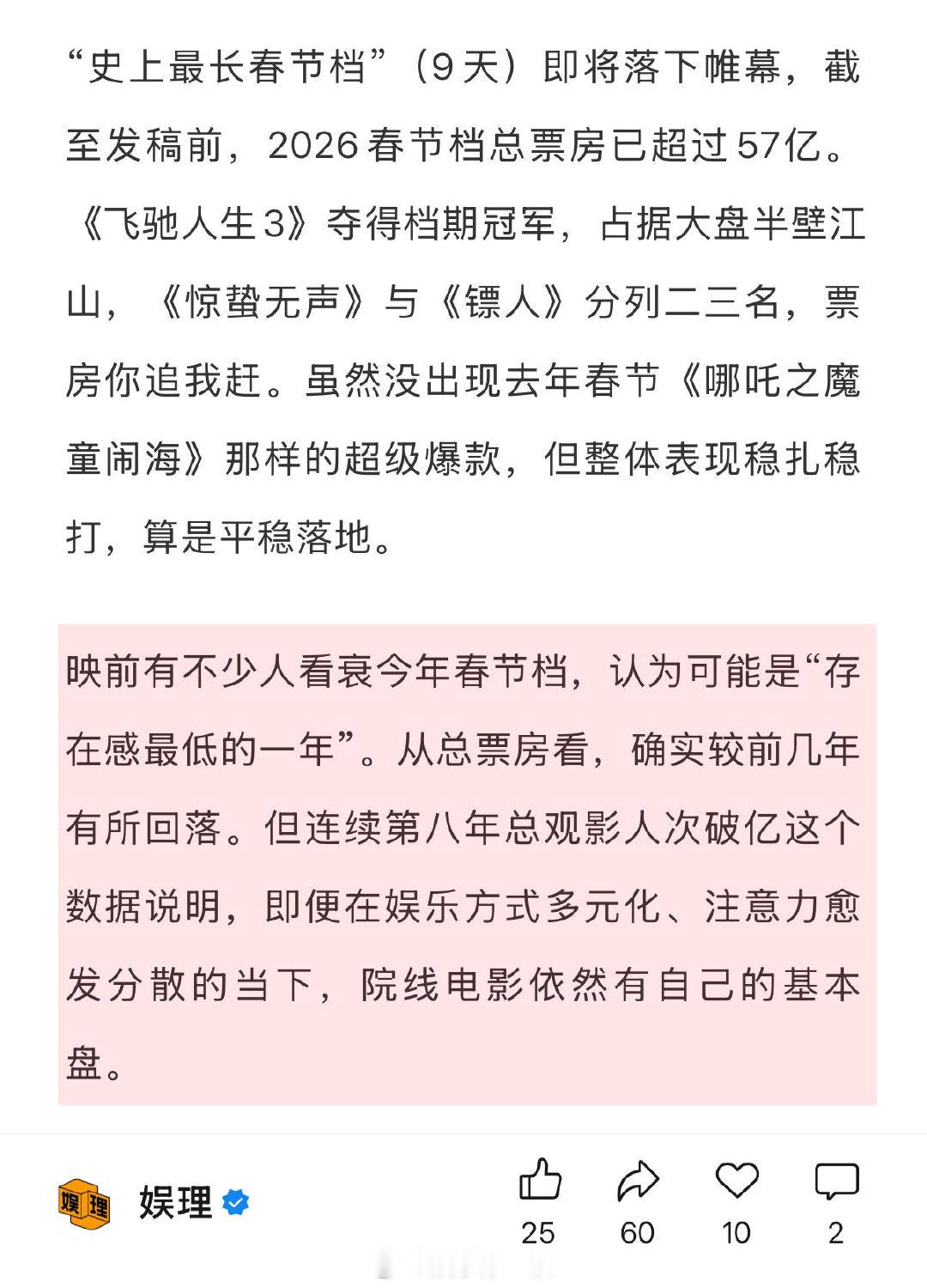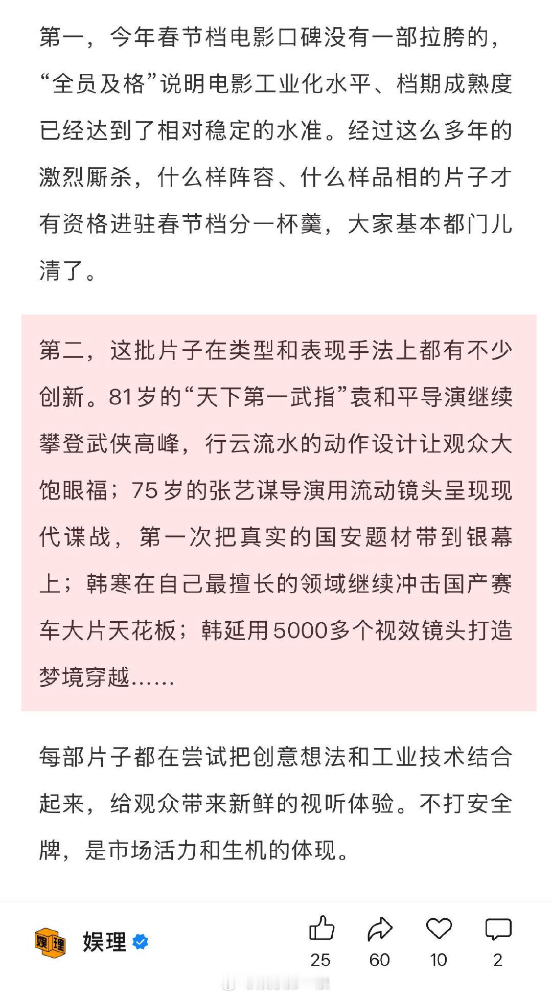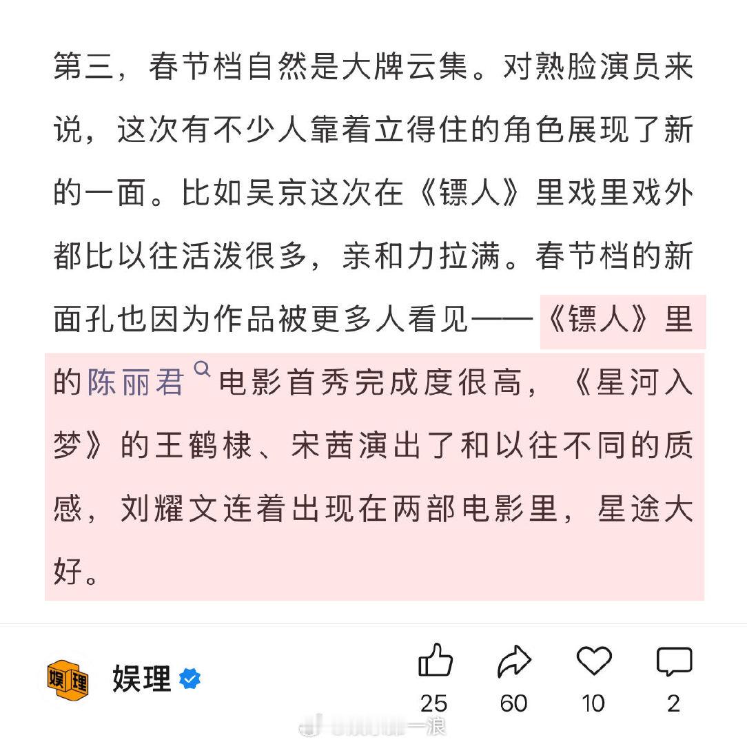 春节档爆款可遇不可求 镖人成春节档最大黑马 今年的春节档电影在类型和表现手法上都有不少创新。81岁的“天下第一武指”袁和平导演继续攀登武侠高峰;75岁的张艺谋导演第一次把真实的国安题材带到银幕上;韩寒在自己最擅长的领域继续冲击国产赛车大片天花板;韩延用5000多个视效镜头打造梦境穿越…娱理独家↓