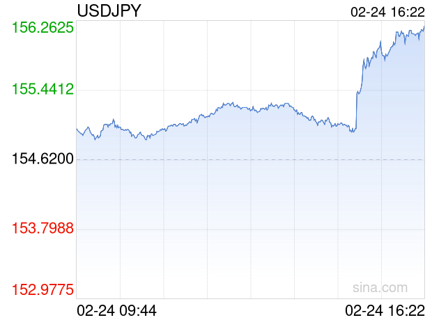 新浪外汇消息2026年02月24日,截至16时22分,外汇市场上美元兑日元汇率突破1美元兑换156.2100日元。涨幅为1.0283%
