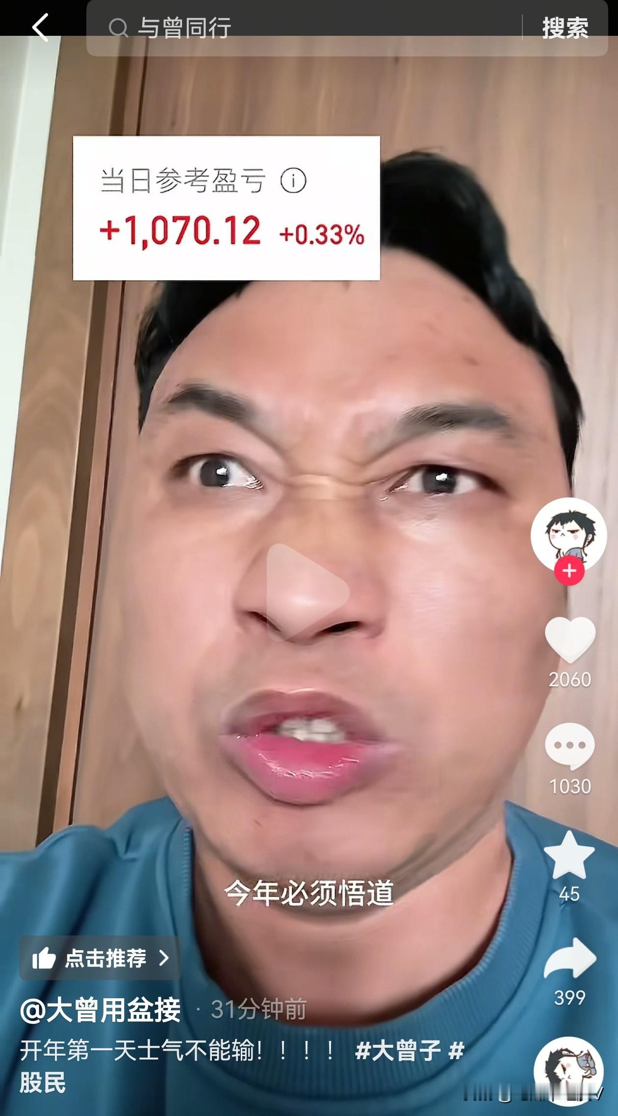 哈哈哈!马年第一个交易日收盘啦!大曾子今天居然收红了,赚了一千块钱,他今年定下的目标是把亏损的 60 万全部拿回来了,看来马年开了个好头,又让他得瑟起来了。 他昨天发视频说过年回家,又从亲戚朋友那里借了点钱过来,这些钱是没有利息的,他会在适当的时机充进去,哈哈哈,我们拭目以待😁大曾子