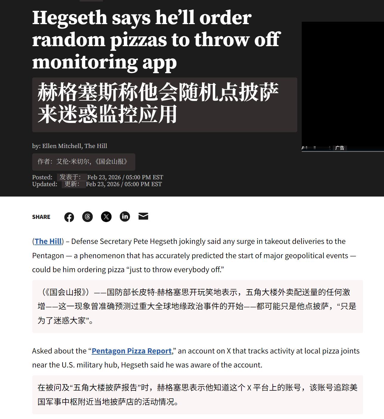 🔻美国媒体:美国防长准备瞎寄吧订披萨,达到堵开源的目的。🔻美国国防部长皮特·赫格塞斯表示,他会考虑在不可预测的夜晚订购大量随机的披萨(例如达美乐),以干扰或迷惑一个非官方的社交媒体账号(“五角大楼披萨报告”)。该账号通过监测五角大楼附近披萨订单或配送量的激增,来作为军事活动升温或行动即将发生的所谓指标。🔻五角大楼附近的两家披萨店报告称,客流量高于平均水平。截至美国东部时间下午 4:50热点现场海外新鲜事美考虑初步打击伊朗国际局势