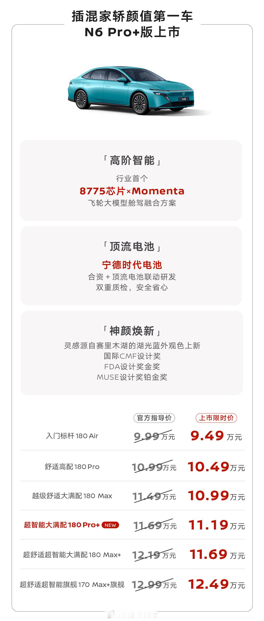 ~ 日产N6新增180 Pro+版,新增蓝色车色,可选车载冰箱和运动包,11万级唯一标配宁德时代电池 + momenta 智能辅助驾驶系统,限时11.19万。