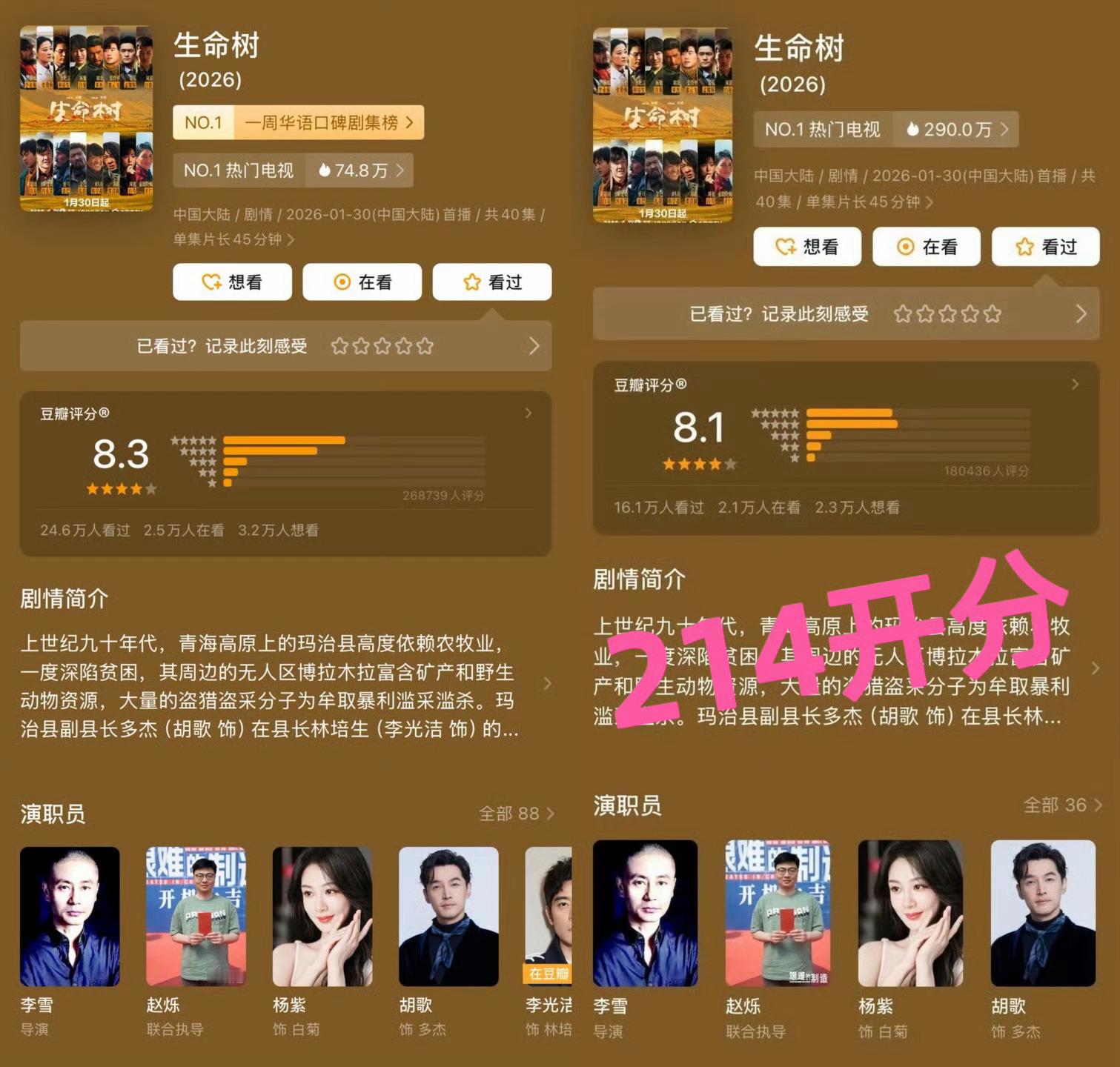《太平年》豆瓣评分由开分的7.8分涨至8.2分《生命树》豆瓣评分由开分的8.1分