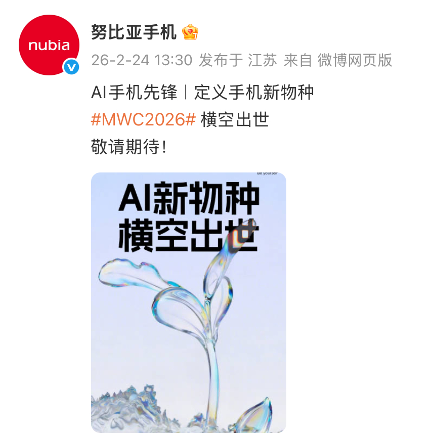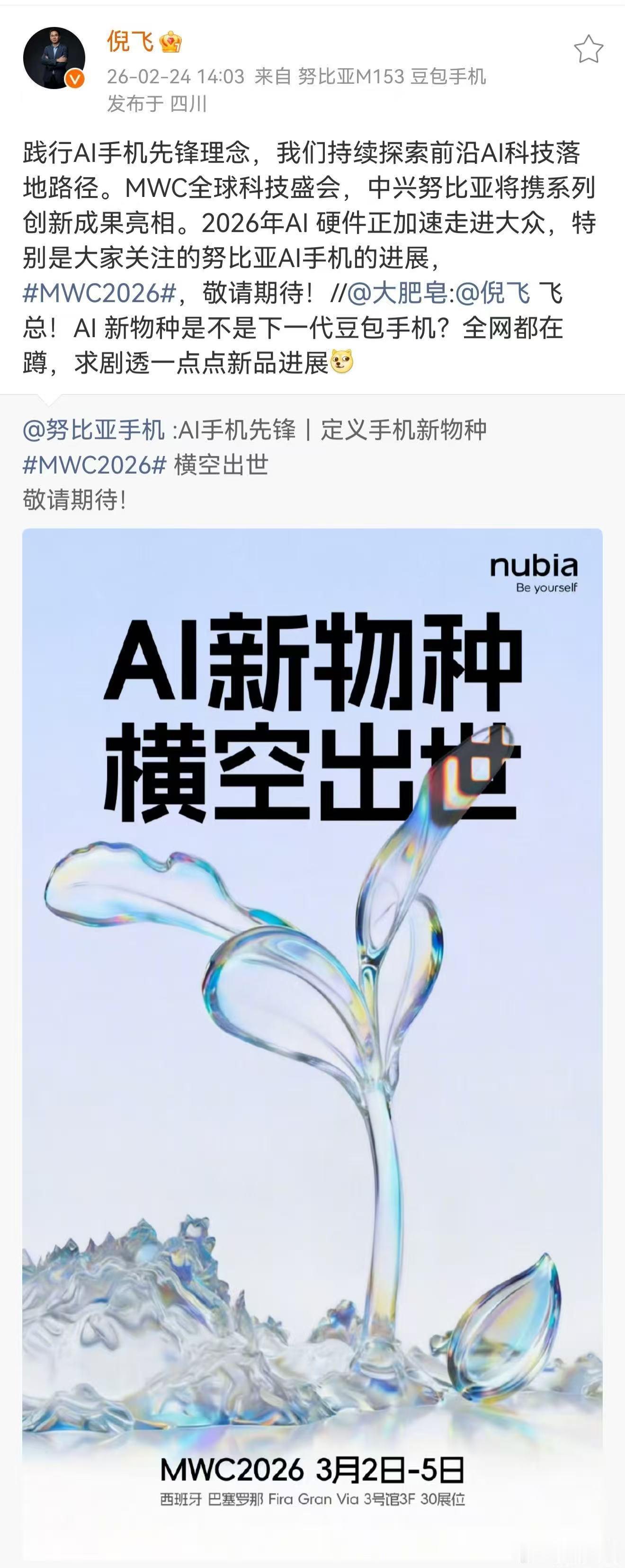 努比亚官宣了会在MWC2026上面,亮相AI新物种。去年豆包手机,着实引起了非常大的关注。AI这一块是各家都绕不开的,不管硬件厂商还是软件厂商。这个新物种,是怎么去定义和呈现的?还是手机形态?或者说是完全不一样的形态。说的是AI手机先锋,定义手机新物种。所以还是手机形态么。更期待接下来厂商们在手机这个领域上面,结合更强的AI能力,给出更多的新形态,来激发更多的可能。倪飞疑似透露新一代豆包手机进展努比亚倪飞称MWC官宣AI手机进展