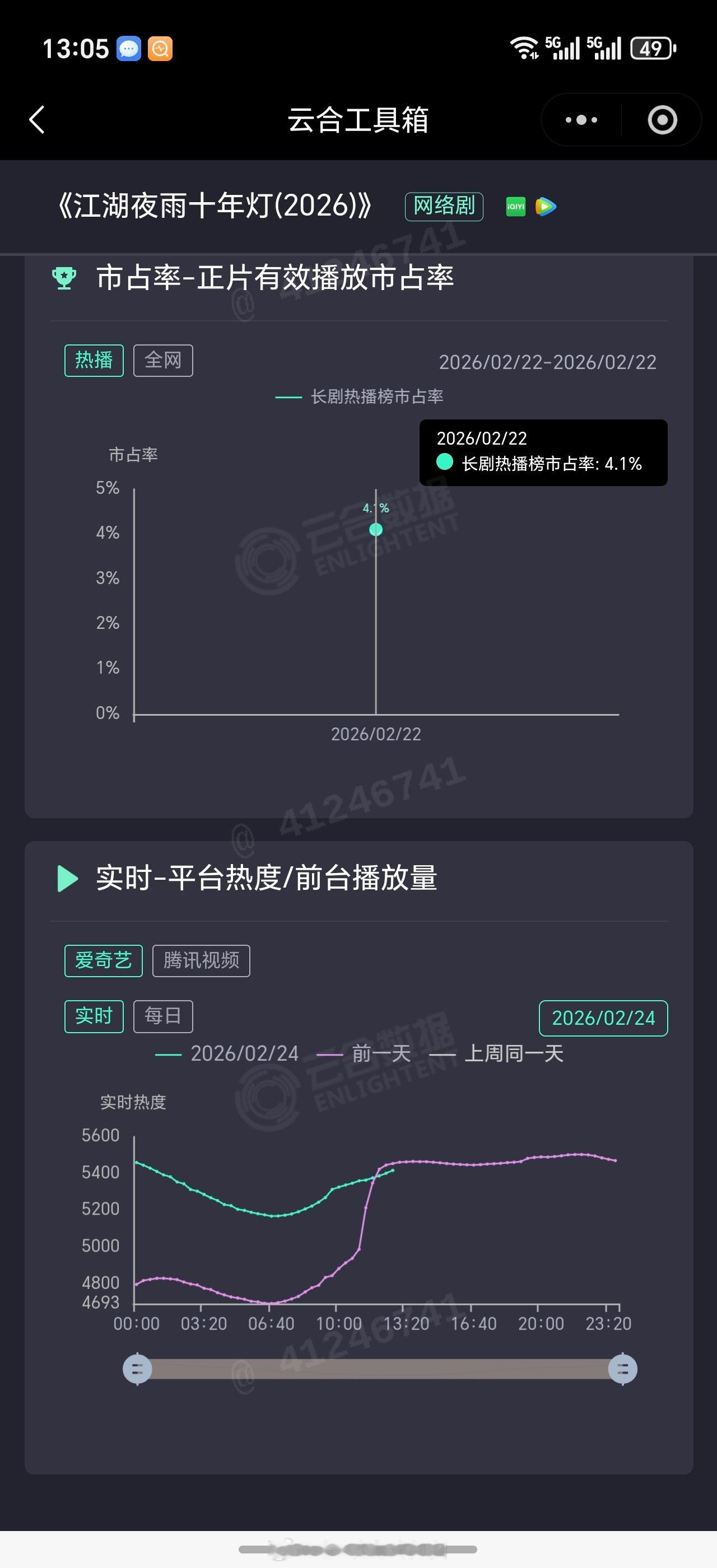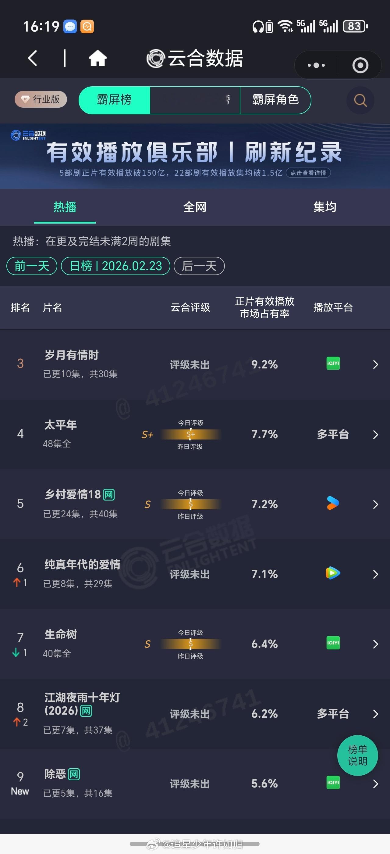 江湖夜雨十年灯次日云合播放量 6.2,应该是在 900 万左右,不知道是否可以突破千万…今天改回傍晚 6 点 更新,热度已经出现交叉,昨天热度差一点点就破 23000 了,不知道今天会表现如何呢?昨天好好的时光首播,网络播出平台是芒果独播,上星央 1 和湖南卫视 1.5 轮跟播,首日云合 2%,播放量在 300 万上下吧,8 点更新,还算不错吧…
