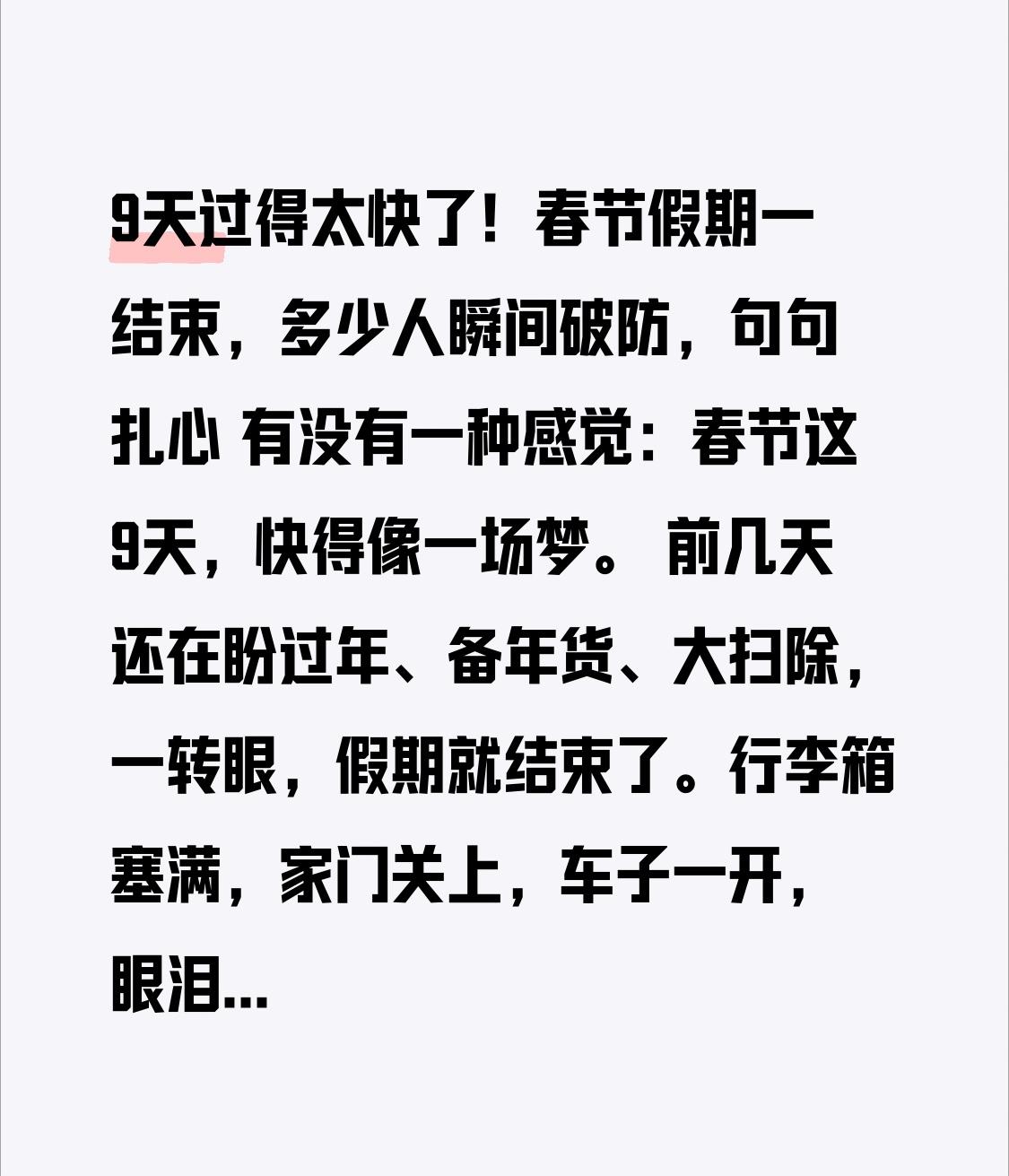 9天过得太快了!春节假期一结束,多少人瞬间破防,句句扎心 有没有一种感觉:春节这9天,快得像一场梦。 前几天还在盼过年、备年货、大扫除,一转眼,假期就结束了。行李箱塞满,家门关上,车子一开,眼泪差点掉下来。明明感觉才刚到家,怎么就要走了? 这9天,我们忙着走亲访友,忙着吃团圆饭,忙着陪父母唠嗑,忙着看孩子嬉笑打闹。不用定闹钟,不用看时间,不用应付工作消息,心里是满的,身边是爱的人。那种踏实和温暖,是平时再忙再累都换不来的。 可快乐总是短暂。 转折点,就是假期最后一天。 前一秒还在说说笑笑,下一秒就要收拾行李。妈妈往包里塞吃的,塞了又塞,好像怕你在外面饿肚子;爸爸嘴上不说,却默默帮你把行李搬下楼,反复叮嘱:路上慢点,照顾好自己。 车一开,家越来越远,心一下子空了。 很多人一回到工作的城市,就陷入了节后分离焦虑:不想上班,不想起床,不想面对压力,一静下来就想家,想家里的饭菜,想一家人围坐在一起的热闹。 明明只有9天,却像是把一年的温暖都用完了。 我们为什么会这么难受? 不是因为懒,不是因为不想上班,而是因为:家里有我们最牵挂的人,有最不用伪装的自己。 在家,你是孩子、是爸妈的宝贝;出门,你就得是能扛事的大人,要赚钱,要坚强,要独当一面。 谁都知道,离别是为了更好的重逢。可每一次分别,还是会难过。 这9天很短,短到来不及好好陪伴;这9天很长,长到足够支撑我们一整年的坚强。 新的一年已经开始,收拾好心情,好好工作,好好生活,好好照顾自己。 不为别的,就为了下次回家时,能让爸妈更放心,能让家更安稳。 离家是为了生活,回家才是归宿。 愿每一个在外打拼的人,都平安顺利,所愿皆所得,下次回家,久别重逢,依旧温暖如初。