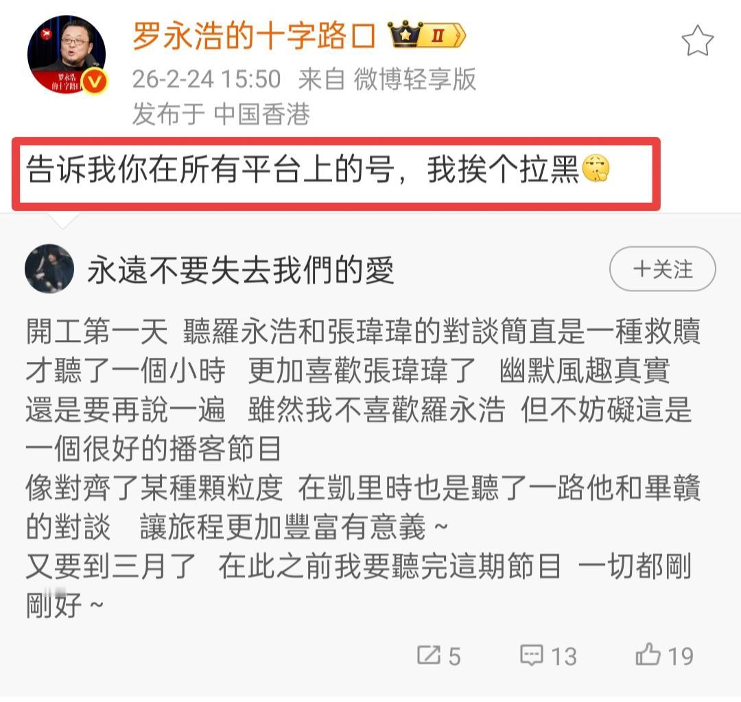 罗永浩的幽默回应。 2月24日,罗永浩在香港。有网友谈到罗永浩的对话节目,称自己更喜欢老罗邀请来的嘉宾音乐人张玮玮,不过同时也表示老罗这档节目做得还是不错的。 老罗看到这番话后,幽默地对这位网友说:“告诉我你在平台上所有的号。” 说真的,老罗做的那个对话节目真的不错。前段时间他还邀请了作家刘震云来参与对话,如今又请到了音乐方面的专业人士。当然,老罗在节目中说话很幽默,控场能力强,这也让他的对话节目在网络上颇受欢迎。