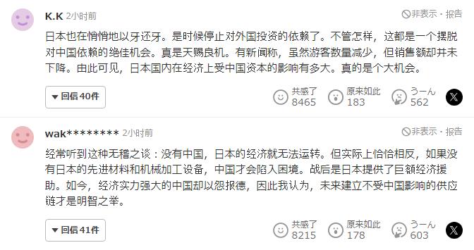 过完年了,开工先收拾小日本。 马年上班第一天,马踏樱花,将20家日本实体列入出口管制管控名单。 日本网民的反应,有觉得要完蛋了,也有觉得无所谓的、日本又赢了,反华的观点主要有: 1.日本被经济胁迫了,意识到风险的日本企业会从中国撤资。 2.日本援助了中国中国才能发展到现在,但现在中国反日了......是中国以德报怨。 3.中国持续升级对抗,而高市坚定维护了日本的立场和利益,令日本国民安心,对高市倍感钦佩。 4.天赐良机,这是日本摆脱对中国依赖的大好机会。 5.“日本经济没有中国就无法运转”是无稽之谈,恰恰相反,没有日本的先进材料和设备,中国才会陷入困境。 6.日本应该全面停止半导体对中国的出口。