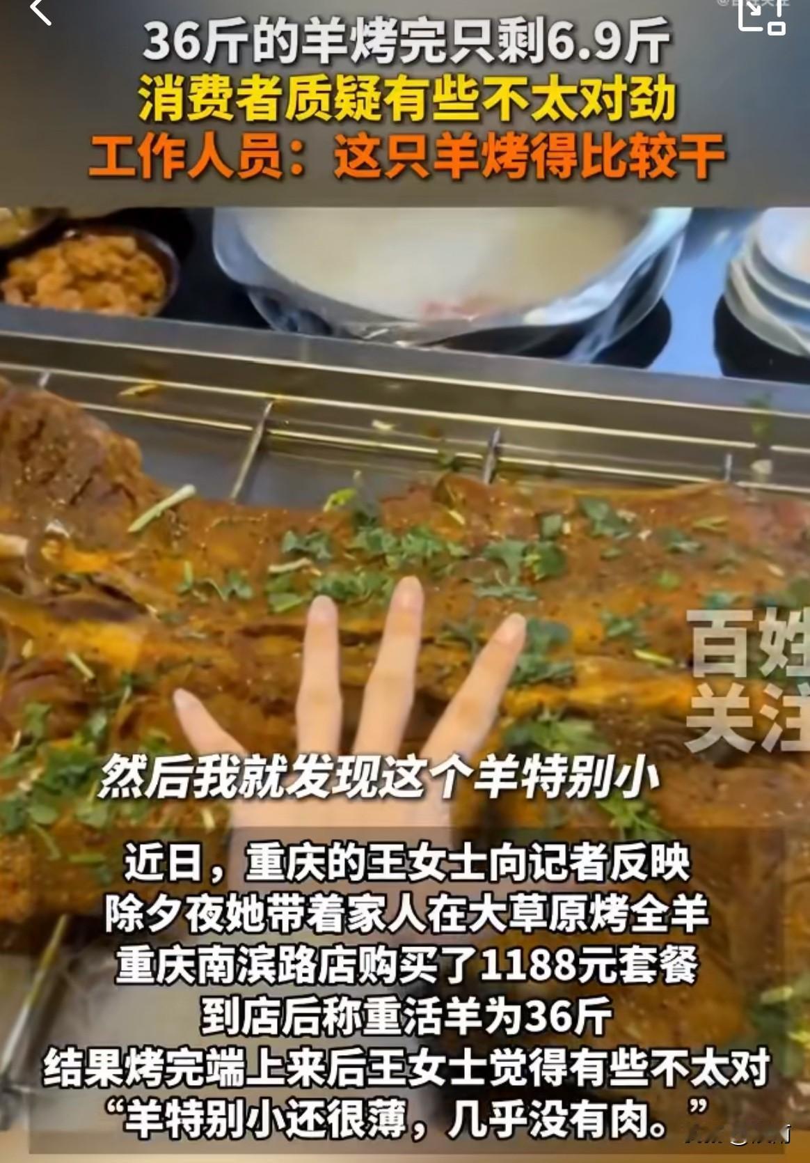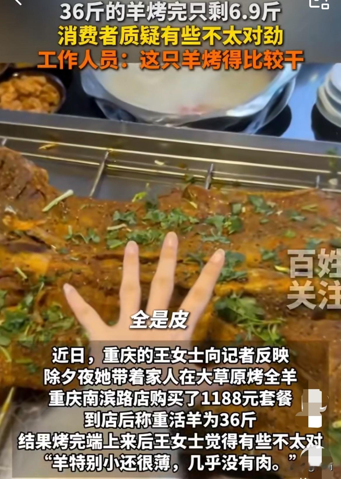 万万没想到。“36斤活羊烤完只剩6.9斤”一事调查清楚了。 此前王女士和家人在这家饭店订烤全羊的时候,想过对方可能会动手脚。 所以,她们亲自选好了羊,还在羊头,羊腿上做好了标记,目睹着饭店工作人员把羊宰好,直到羊烤上了她们才离开。 但令她们没想到的是这只36斤的羊在称重之前早被灌入了大量的水,并且持续的让羊吃了大量的玉米饲料,以达到增加重量的目的。 难怪这只被她们精心挑选的36斤的羊,烤出来却只有6.9斤了,又瘦又小,几乎没有肉,全是皮了。 真的是防不胜防,谁能想到饭店会做出这样的勾当。最终还是搬起石头砸自己的脚,等着接受处罚吧。