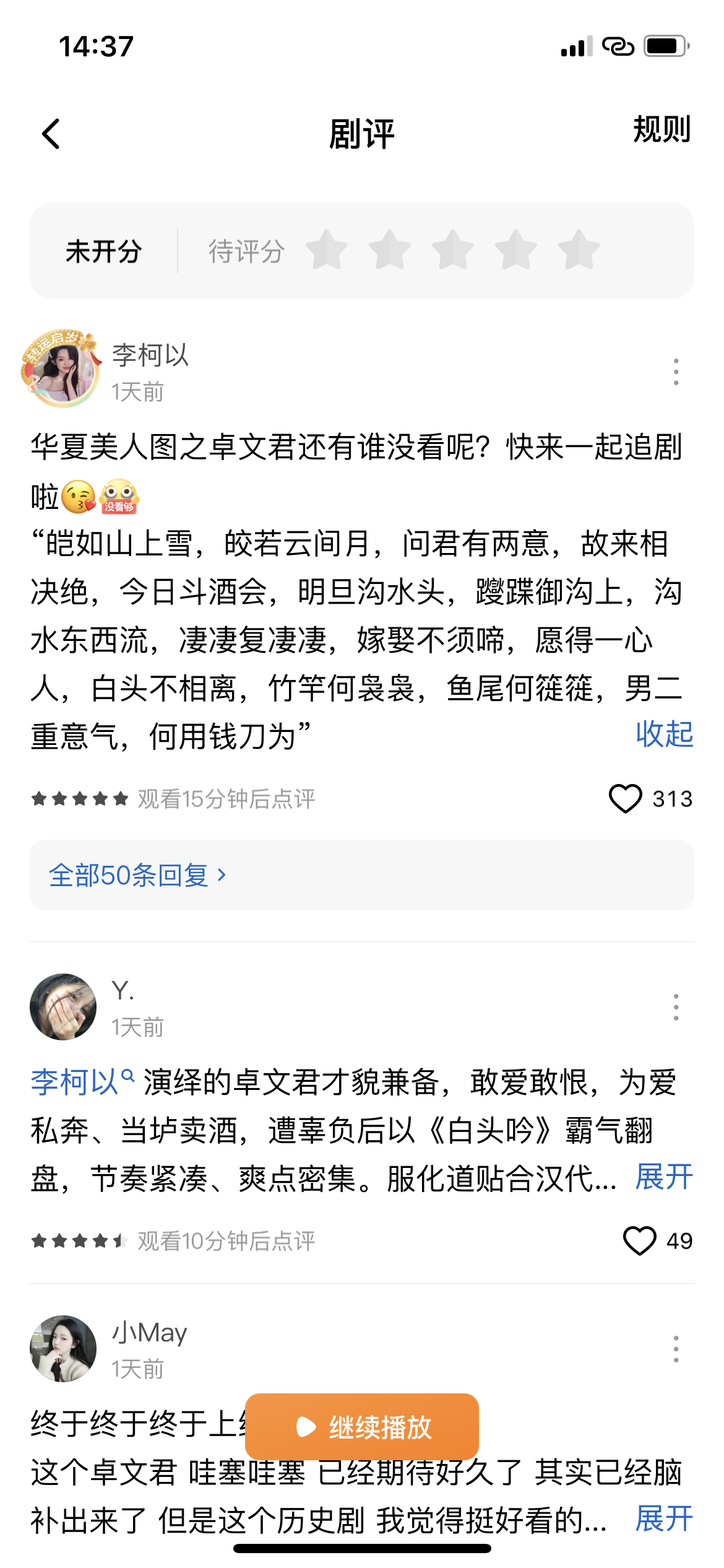 李柯以这部历史短剧《卓文君》首日热度3654。但我要夸,夸李柯以接拍历史题材都要夸。她演得也比较贴。这剧肯定没有投流,也没有站内资源,真的是李柯以单扛了。但主要问题是——导演和编剧是一个人,我秒懂。历史剧不下沉,咱就按照历史题材的台词风格故事逻辑来不行吗?不会学学《太平年》?