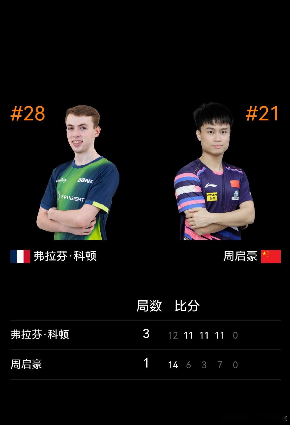 周启豪1比3科顿2月24日,WTT新加坡大满贯男单1/16决赛 ,周启豪1-3(14-12,6-11,3-11,7-11 )不敌弗拉维安-科顿,无缘男单16强。周启豪其实如果按照第一局的打法还是可以的,但是后面节奏被拖着走了!