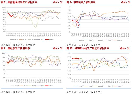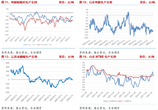 受春节假期影响,多数下游行业呈现季节性疲软态势,开工率普遍下滑,对甲醇需求形成明显拖累。具体来看,冰醋酸装置产能利用率80.09%,环比下降1.63个百分点,同比下降10.65个百分点,受下游醋酸酯行业需求疲软及企业春节检修影响,开工率小幅下滑,对甲醇的采购需求减少;二甲醚装置产能利用率5.46%,环比下降0.55个百分点,同比下降1.31个百分点,二甲醚行业需求持续低迷,企业开工意愿极低,需求端对甲醇的拉动作用微弱;甲醛装置产能利用率19.25%,环比下降11.6个百分点,同比下降11.6个百分点,作为传统下游中受房地产行业影响最大的领域,甲醛行业节前逐步停工放假,开工率大幅下滑,成为传统需求中拖累最大的板块;山东MTBE装置产能利用率67.87%,环比下降0.14个百分点,同比上涨8.83个百分点,整体开工相对稳定,同比上涨主要得益于汽油需求的稳步复苏,对甲醇需求形成一定支撑,但节后复工进度缓慢,需求尚未完全释放。整体来看,传统下游需求仍处于季节性低谷,节后随着企业逐步复工,需求有望缓慢复苏,但短期内难以形成有效拉动,整体需求端仍显疲软。