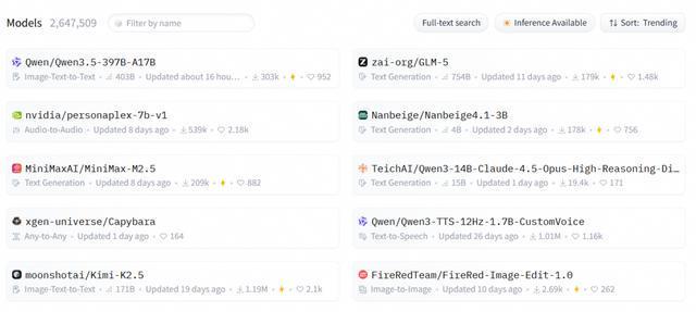 2月24日,全球最大AI开源社区HuggingFace公布新一期开源大模型榜单。榜单显示,阿里最新开源的原生多模态模型千问3.5登顶全球榜首,成为近期最受全球AI开发者关注的开源大模型。英伟达研发的personaplex-7b,以及MiniMaxAI研发的MiniMax-M2.5分列二三名。