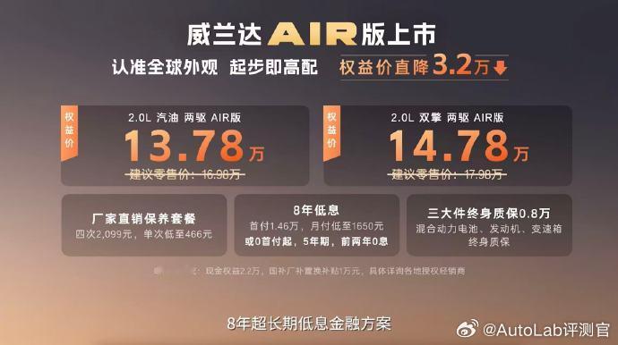 威兰达AIR版上市13.78万起广汽丰田发布厂家直销保养套餐