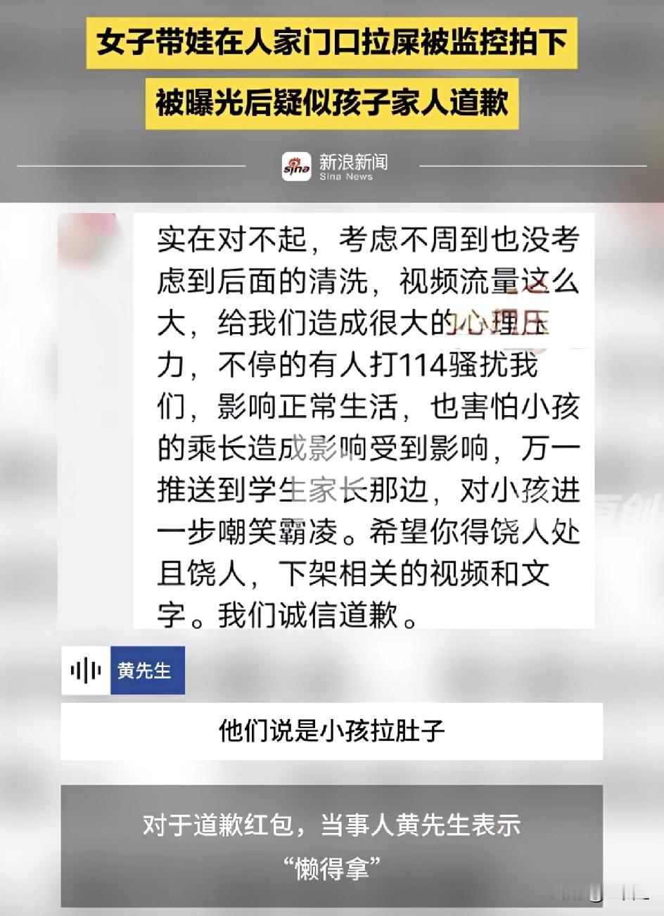太过分了!广东一男子家门口被人“方便”,监控拍下大人带娃当场排便,曝光后疑似家长发红包求删视频!房主:懒得要! 2月23日,广东揭阳一男子黄先生遇到一件特别糟心的事。 大年初五,他在家门口发现了污物,一查监控,直接气笑了。 原来是大人带着孩子,直接在他家门口就地解决,拉完就走,连清理都没清理。 视频曝光后,疑似家长私信过来解释,说孩子拉肚子,实在找不到地方,还发了红包道歉,希望黄先生把视频下架。 结果黄先生直接表态:红包懒得拿! 视频曝光,评论区一片嘘声: “但凡是个正常人,都不会跑人家门口拉,说明平时为人就不咋地! “孩子小可以理解,但大人太没素质了,拉完至少清理一下吧!” “他们并不是想道歉,只是想删掉视频,并且不承担该事件的后果!” “这么多路边不能拉非得去人家门口吗?还不清理就走?” “换谁家门口遇到这事,都得生气,支持屋主不原谅!” “道歉有用还要公德干嘛?红包都懒得拿,太解气了!” 孩子小、憋不住,大家都能理解。 但大人在场,就算真的来不及,拉完也该清理干净,而不是把麻烦留给别人。 就算是遛猫遛狗,拉在公众场合,主人还得遵守清理干净的义务,更何况是人呢! 一句“找不到地方”,真不是不讲公德的理由。 家门口不是厕所,做人最基本的素质不能丢。不要等到被曝光了,才想起后果严重,难以承担! 素材来源:新浪新闻,侵联删!