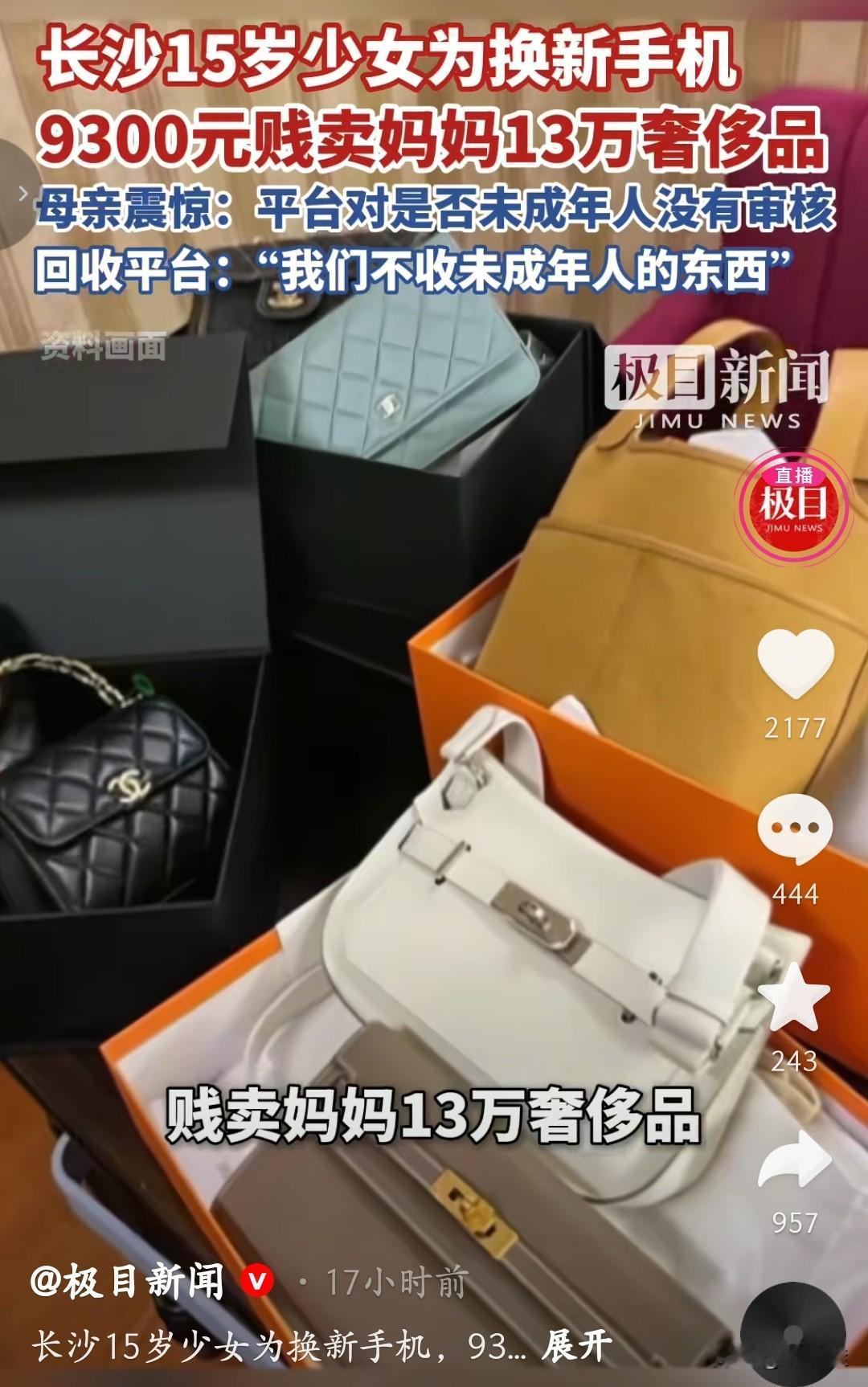 15岁少女9300元贱卖妈妈13万奢侈品换新手机的事,有同谋,而且还是分批次卖的! 长沙一名15岁少女,为了换一部新款手机,联合两名同学,分6次将妈妈价值13万多的奢侈品偷偷卖掉,最后只到手9300元。 其中,46200元买的卡地亚手表,被2000块回收;29500元的迪奥包包,只卖了1500元;12500元的浪琴手表,更是只换了850元。 这件事像一面镜子,照出了二个问题: - 孩子的消费观和规则意识严重缺位,为了攀比不计后果; - 家庭教育中,对孩子的金钱观教育和家中贵重物品的管理都存在缺失。 现在妈妈既心疼又气愤,希望能追回物品或挽回损失,而这件事也给所有家长提了醒:别让“富养”变成教育的盲区,更要教会孩子对规则和他人财物保持敬畏。