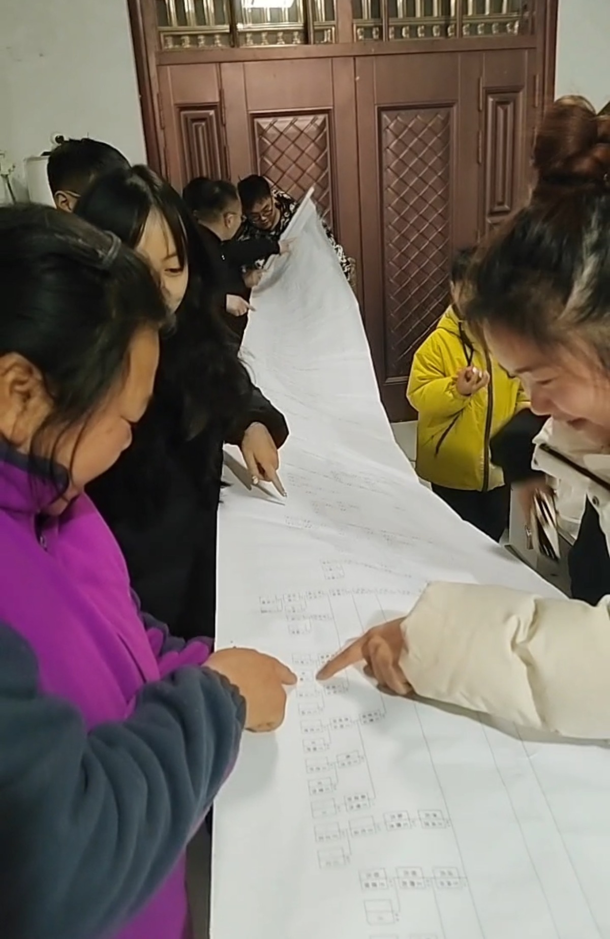 家谱完成后恰逢新春佳节,家族成员拜年团聚时,纷纷前来观赏这幅特殊的长卷。以往不少晚辈对“五服”以内的亲属关系模糊不清,如今对照直观清晰的世系图,很快便能理清亲缘脉络。孩子们争相查阅、主动询问家族故事,在了解根脉渊源的过程中,彼此间的亲近感明显增强,家族凝聚力进一步提升。