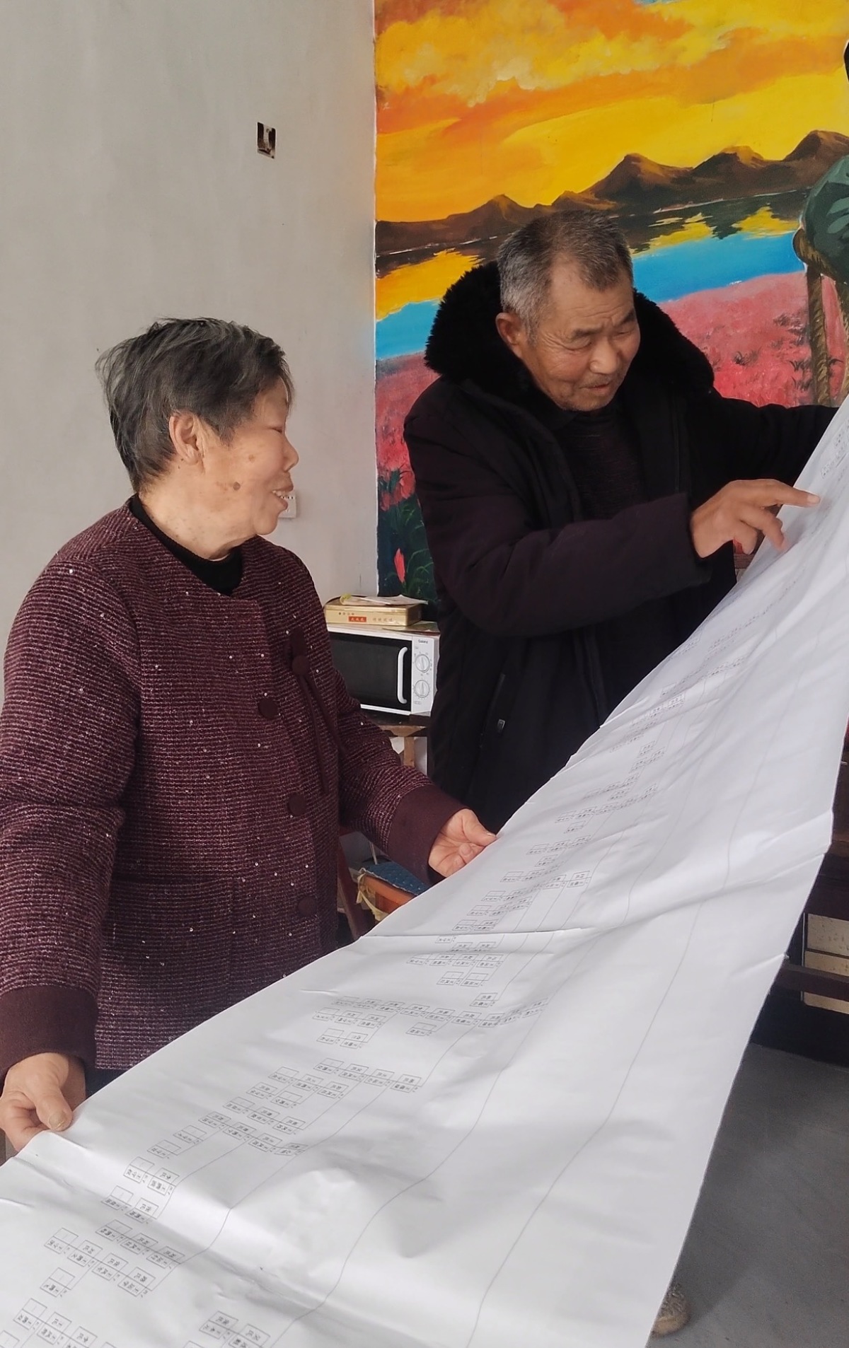 春节期间,柘城县牛城乡村民王守杰家中格外热闹。他耗时两个月精心绘制的12米长王氏家族世系图正式亮相,成为家族春节团聚时最受关注的“新年礼物”。不少年轻人围在长卷前,仔细查找自己的辈分与亲属关系,在一笔一划间读懂血脉传承,感受家风温度。