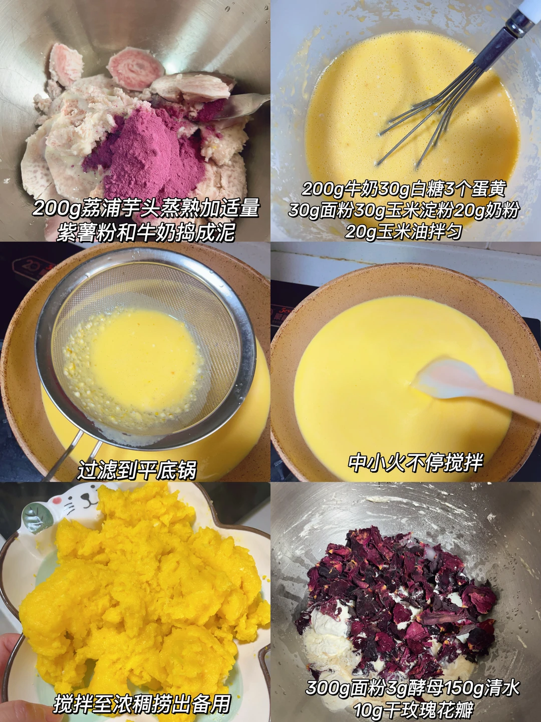 1⃣️芋头上锅蒸熟,蒸熟后加适量紫薯粉和牛奶捣成泥备用