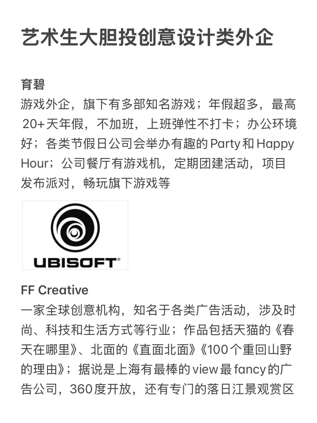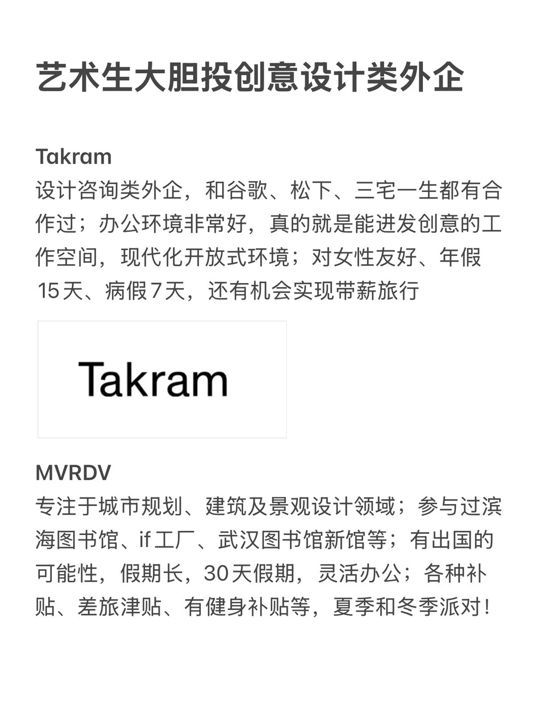 年后找工作,艺术生真的可以大胆去尝试创意设计外企。 创意设计外企才是真正懂艺术生的地方,这里更看重你的想法、审美、表达力。 · 为什么艺术生值得去创意外企? 对女性友好,团队氛围轻松 假期多,年假10起步,还有圣诞假、生日假... 注重wlb,支持居家办公,下班早 · 坚持日更✊🏻,帮大家在找工作路上顺利拿 offer!