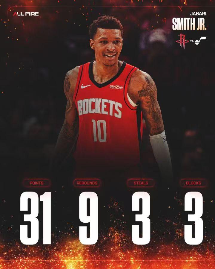 火箭轻松击败爵士后排名得到提升,火箭战绩摆脱湖人反超掘金,再次回到西部第三。 本场比赛火箭首发5名球员合计砍下96分,赛后火箭社媒晒出首发球员的数据海报并配文道:我们的首发球员太棒了! 小贾巴里·史密斯今日出战32分钟,17投12中,其中三分球11投6中,罚球2投1中,得到31分9篮板3抢断3封盖。数据显示,史密斯打出了个人职业生涯最高效的一场30+,他本场真实命中率高达86.7%! 值得一提的是,火箭球员正负值方面,仅芬尼·史密斯一人出现负值,他全场出战20分15秒,三分4中1,得到3分4篮板4犯规,正负值为-5,全队唯一负值。