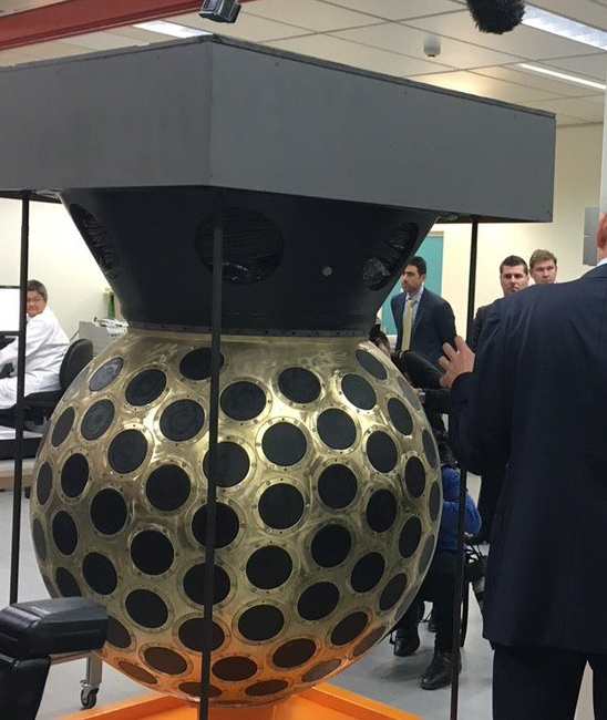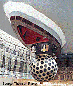 烽火问鼎计划每天认识一件兵器 中国台湾省海军“康定”級巡防艦(法国“拉斐特”级护卫舰的台湾省定制型号)装备的法国Thomson Marconi TSM-2633 Spherion-10B舰首中频主/被动声呐的球形水听器阵列(图)。
