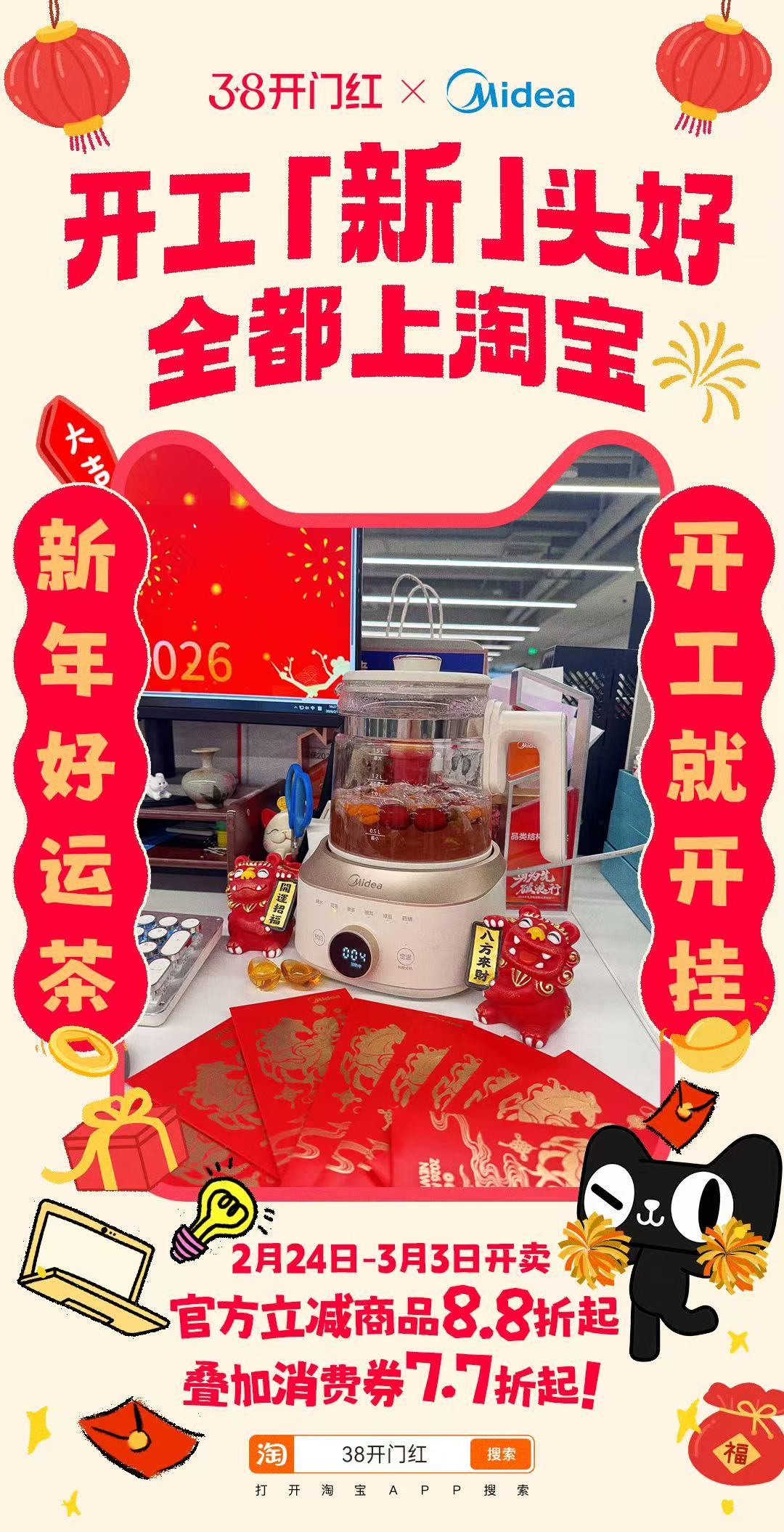 开工先开运,当然就要先淘个好彩头!品质生活选美的,省心省力每一天。来天猫搜索【38开门红】,官方立减8.8折起,叠加消费券7.7折起,开工新头好,全都上淘宝。上淘宝开工淘个好彩头开工新头好全都上淘宝