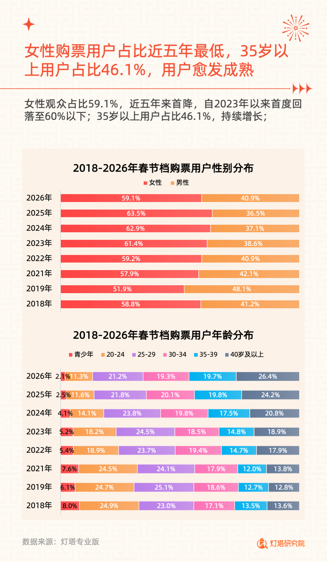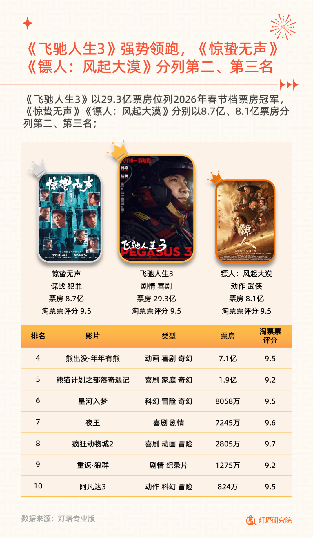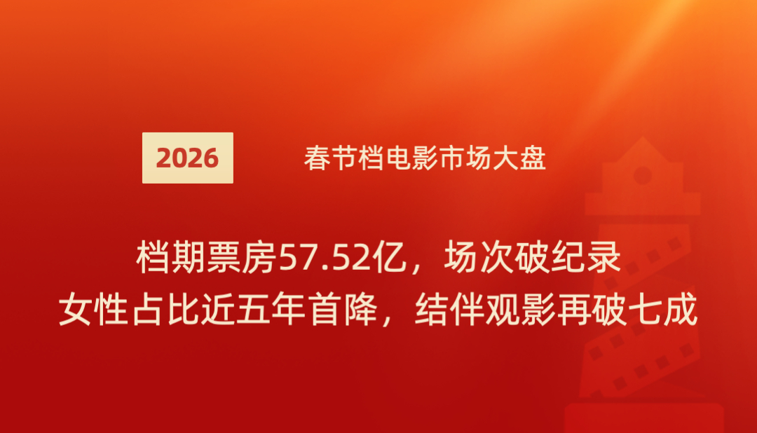 灯塔2026春节档数据洞察据报告显示,2026春节档档期票房57.52亿,场次破纪录,女性观影占比近五年首降。单片方面,《飞驰人生3》强势领跑,《惊蛰无声》《镖人:风起大漠》分列第二、第三名,市场呈现影片类型题材多元化、观影社交化与渠道下沉化趋势。春节档马上有戏